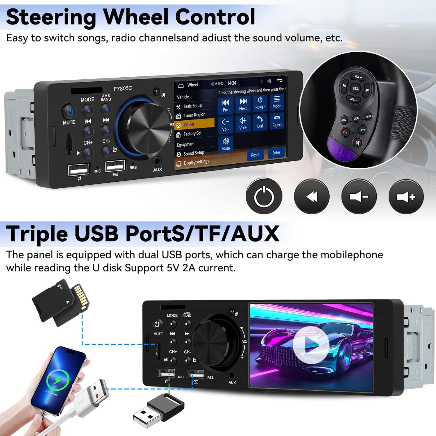 - Bluetooth Connect: Single din hands-free Bluetooth audio receiver with stable signal, car radio can easily connect to mobile phones and built-in microphone, support hands-free calling, making it safer for you to answer or make phone calls while driving. The car audio radio connects to various mobile devices through Bluetooth, making travel full of music and fun and easy driving