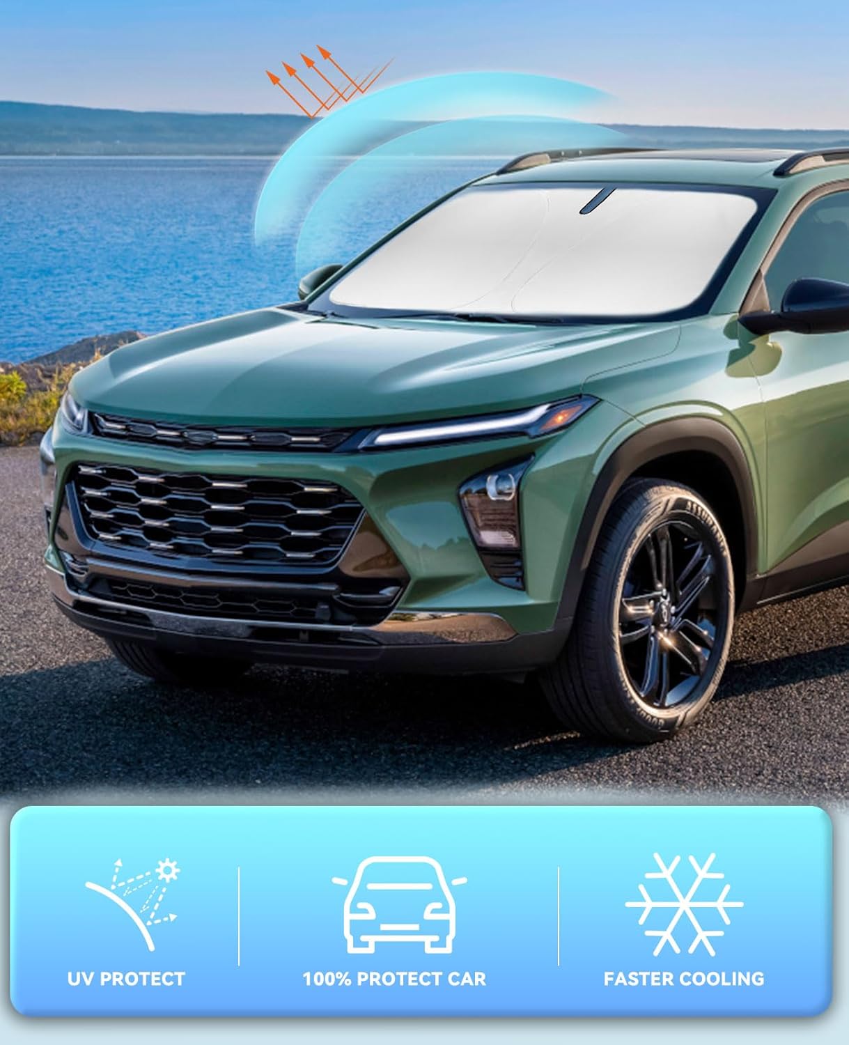 - ăVehicle SpecificăOur Windshield Shade Cover custom fit for 2013-2023 Chevrolet/Chevy Trax LS, LT, LTZ, Premier, SUV Accessories ,Full covered your windshield,No Gap,100% Perfect fit. The precise fit design and reinforced steel ring are sufficient to allow the sun shade to precisely fit the front window without the need for suction cups to hold it in place, effectively protecting your car from the sun's rays.