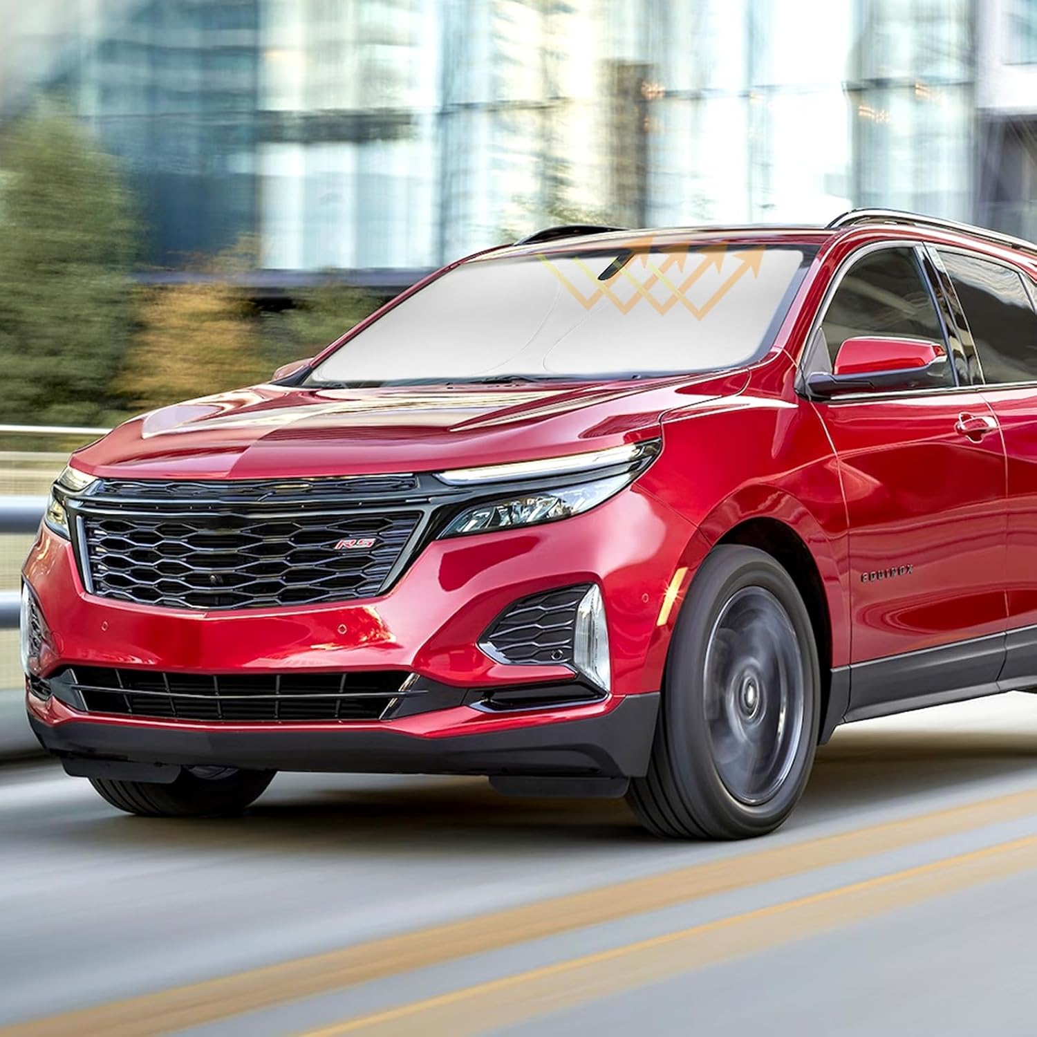 - ăVehicle SpecificăOur Windshield Shade Cover custom fit for 2010 2018-2024 2025 Chevy Chevrolet Equinox Accessories ,Full covered your windshield,No Gap,100% Perfect fit. The precise fit design and reinforced steel ring are sufficient to allow the sun shade to precisely fit the front window without the need for suction cups to hold it in place, effectively protecting your car from the sun's rays.