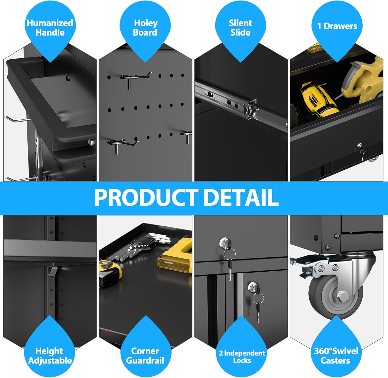 - Ample Storage Space and Pegboard: The garage cabinet with wheels includes 1 drawer and 1 adjustable shelf, giving you customizable storage options for various tools and supplies; the multifunctional pegboard on the sides are convenient for hanging things, get effortless accessible for a variety of small hardware;