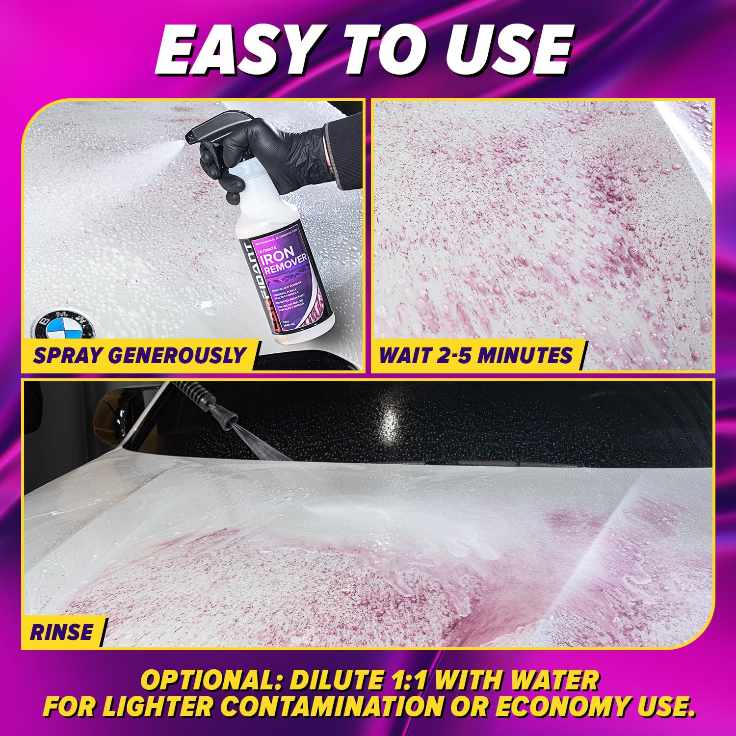 - EASY TO USE - SPRAY, REACT, RINSE - Simply spray onto the surface, let it react with iron particles, and rinse off. No scrubbing needed. Perfect for car detailing and deep cleaning before waxing or car wash.