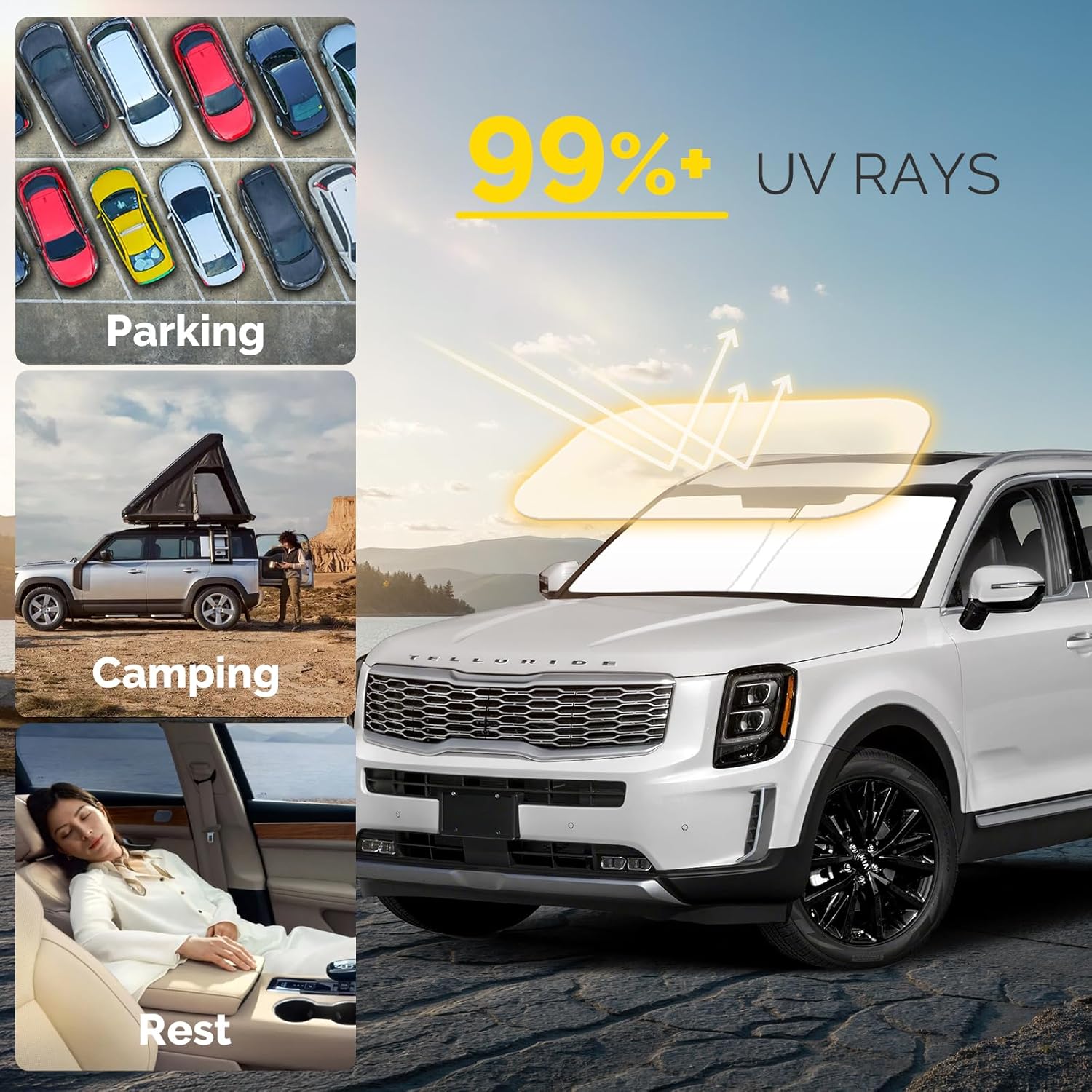 - 【Vehicle Specific Windshield Sun Shade】our car windshield sun shade is specially designed for 2020 2021 2022 2023 2024 2025 Kia Telluride accessories windshield, designed to protect your car interior from excessive heat and sunlight when parked, keep your car cool.