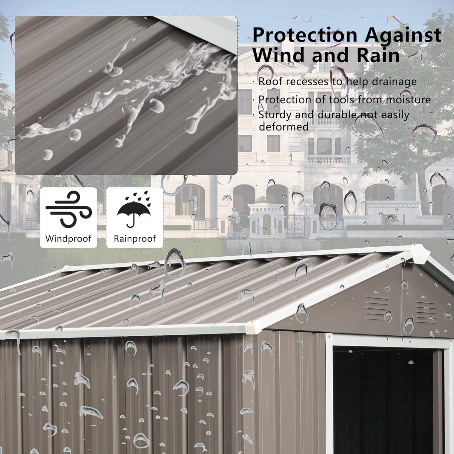 - ๐ก๐๐ฅ๐ฅ-๐ฐ๐๐๐ญ๐ก๐๐ซ ๐๐ญ๐จ๐ซ๐๐ ๐ ๐๐ก๐๐: Our metal shed 6x5 features smooth sliding doors with handles and a heavy-duty lock for enhanced security. This practical storage building is perfect for storing gardening tools or serving as a warm pet house. The sloped roof effectively prevents leaks and snow buildup, while the transparent side window provides soft natural light. Four integrated punched vents improve airflow, keeping items dry and well-preserved in any weather conditions.