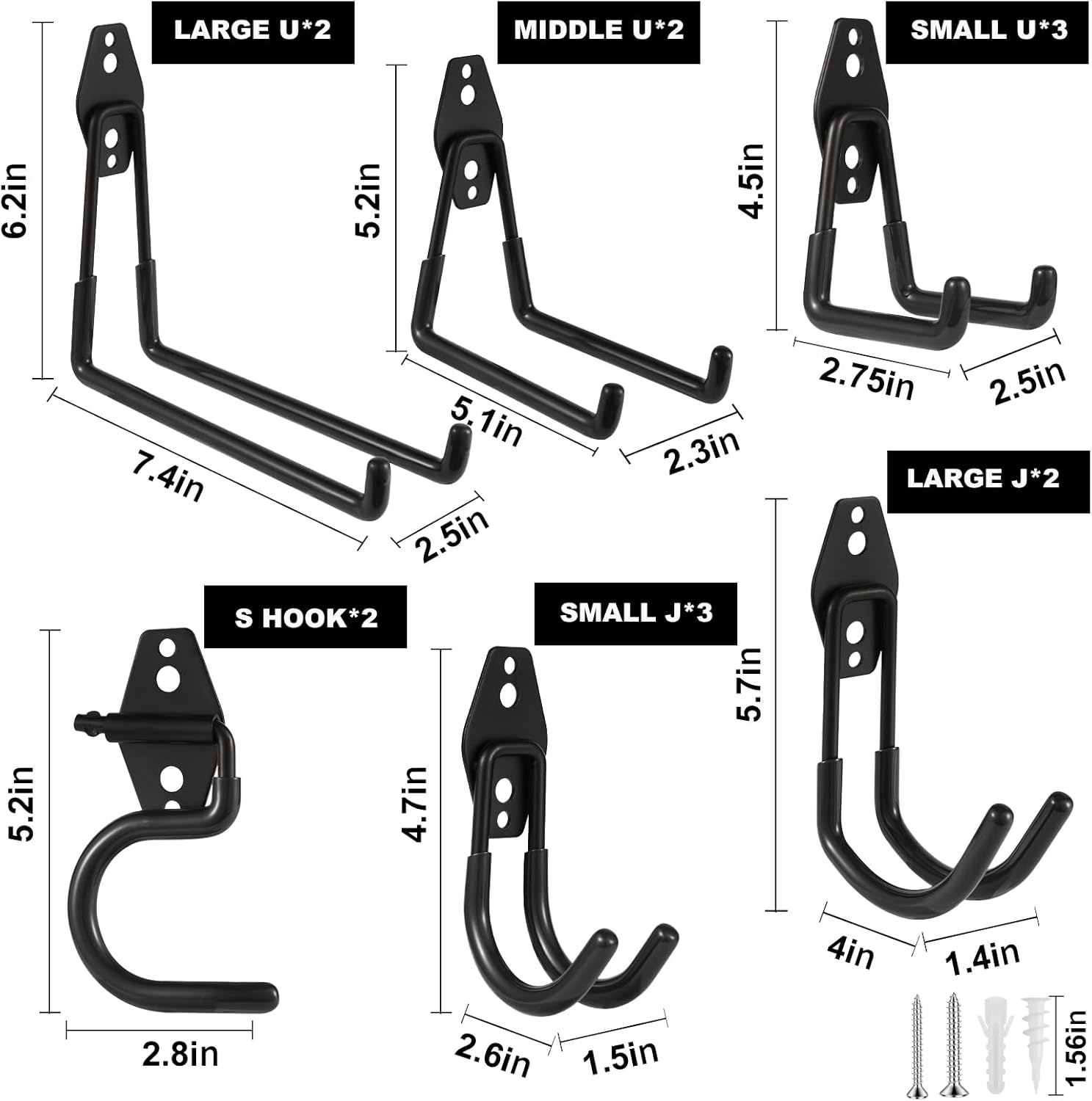 - ZexHok Wall Hook Assortment Set: 14pcs storage hooks include with 6 sizes: 3pcs small J hooks, 3pcs small U hooks, 2pcs large J hooks, 2pcs middle U hooks, 2pcs large U hooks and 2pcs S hooks, for hanging tools of different sizes and weight.
