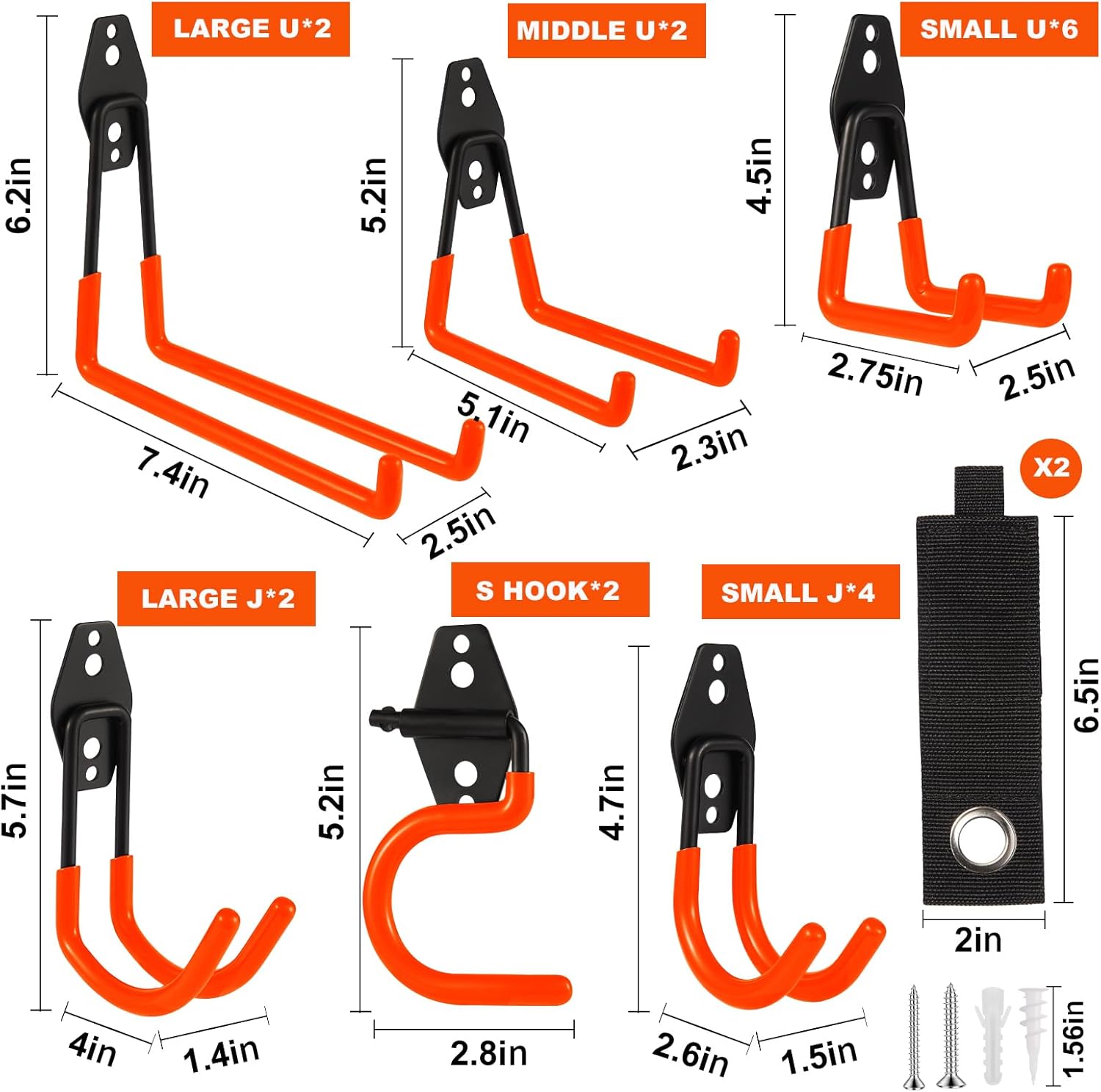 - ZexHok Wall Hook Assortment Set: 20 pack storage hooks organizer include with 6 sizes: 4pcs small J hooks, 6pcs small U hooks, 2pcs large J hooks, 2pcs middle U hooks, 2pcs large U hooks, 2pcs S hooks and 2pcs straps for hanging tools of different sizes and weight.
