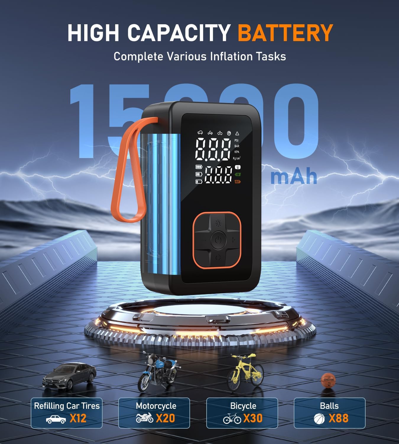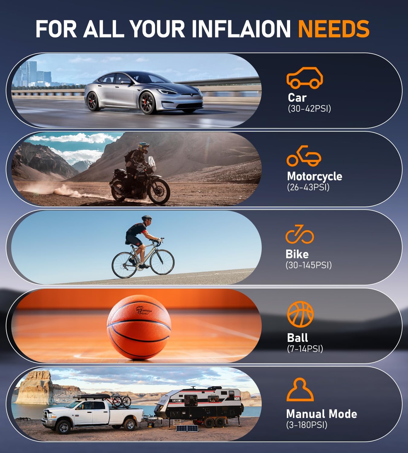 - 【4+N Intelligent Modes】With a dual display screen, you can easily read tire preset value and real-time pressure value. 4 preset inflation modes: bicycle, motorcycle, car, and ball. The manual mode can also set the pressure value (3-180psi) according to the inflation object. Our portable air compressor meets all your inflation needs