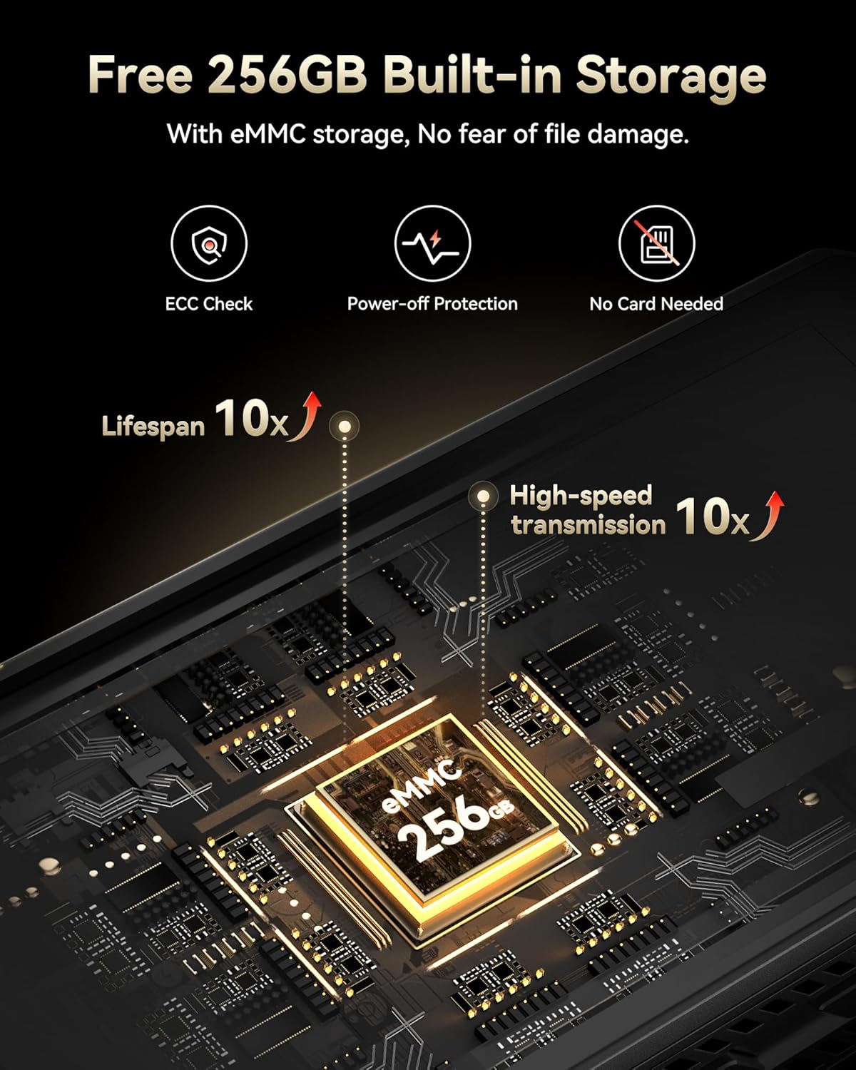 - [Upgrade 256GB eMMC Storage] With a massive 256GB eMMC storage, the F77 V2 dash cam for car eliminates the need for card, erased and written 10X than a normal card, and it has ECC checking and power-off protection, which allows you to safely save videos due to impact, unlike the card may be damaged. REDTIGER 4K dash cam can hold hours of 4K footage, making it ideal for long drives or road trips.