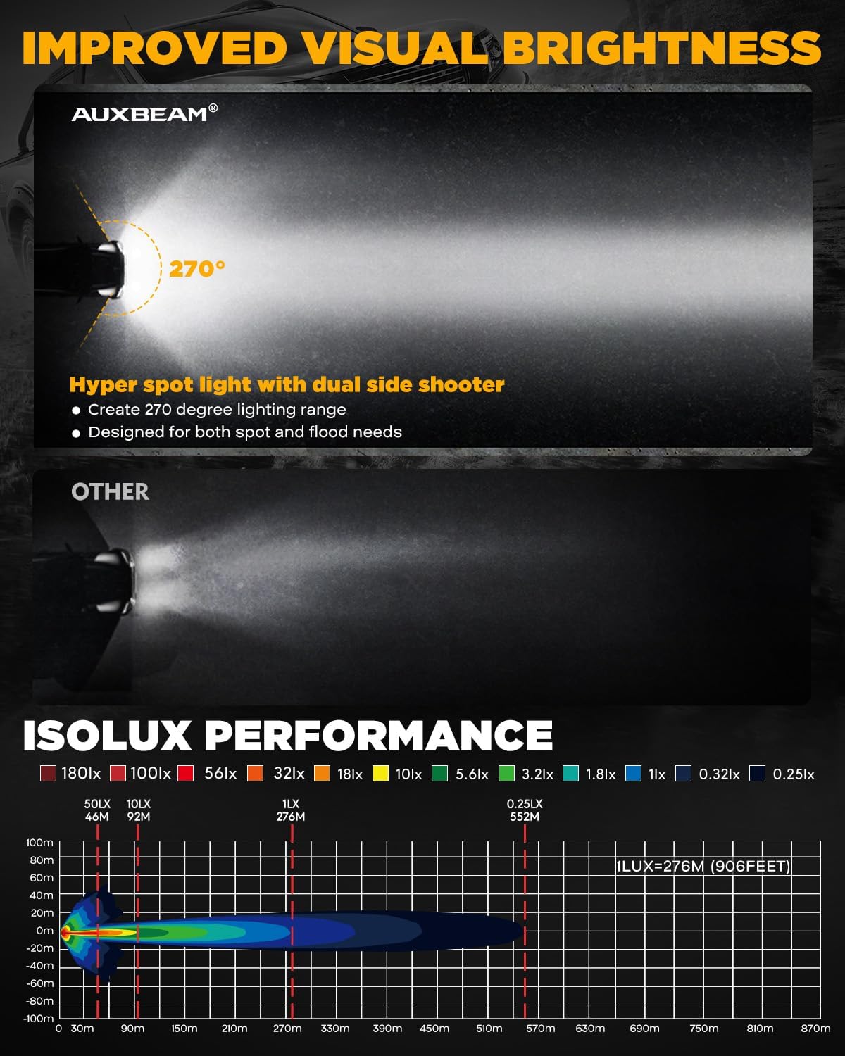 - 【Shine Bright Like a Rockstar】Turn night into day with 108W of P8 LED and 2835 SMD brilliance! With a massive output of 12,800 lumens, you’ll see up to 906 feet at 1 LUX. Experience precision beams that eliminate glare and enhance clarity, making every adventure unforgettable with Auxbeam V-Ultra Series!