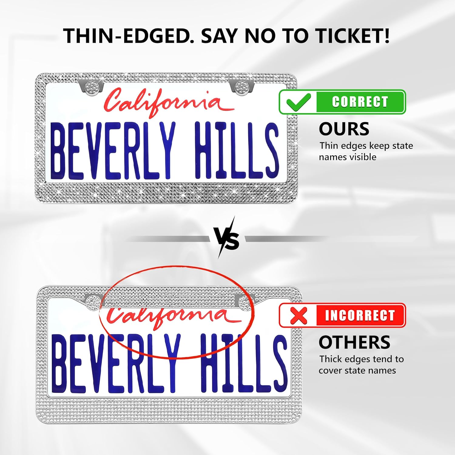 - PROTECTIVE DESIGN: Crafted from durable stainless steel, our diamond car plate frame offers superior strength, corrosion resistance, and stability. They prevent the diamond license plate protectors from bending or warping while protecting your carâs paint from scratches.