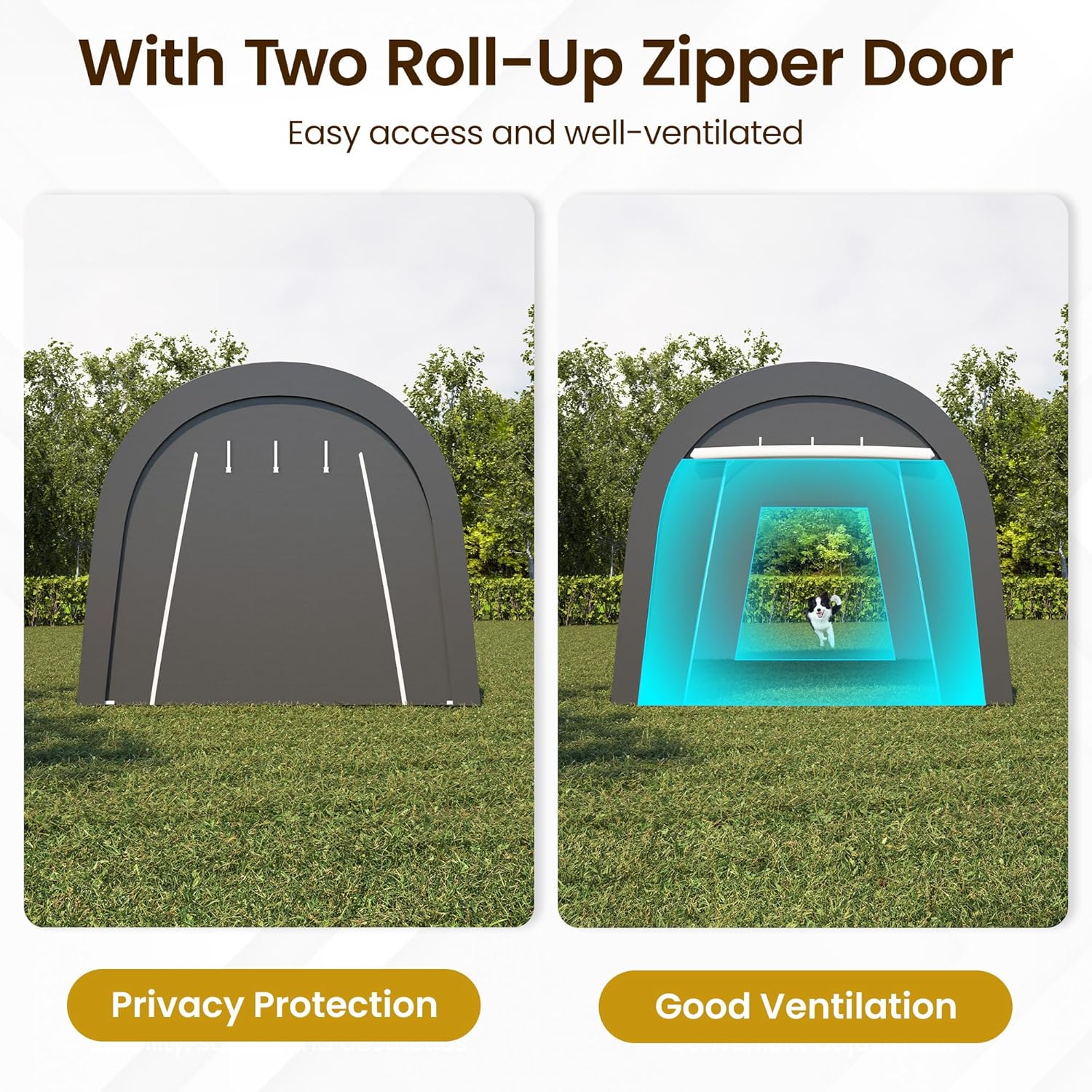 - 2 ROLL-UP DOORS: The outdoor storage shed features two roll-up doors at the front and back, which can be closed or rolled up. Closing the doors to keep a dry environment inside, especially during rain or snow, while also increasing privacy. Rolling up the doors offers easy access, improves airflow, and lets in natural light, brightening the carport
