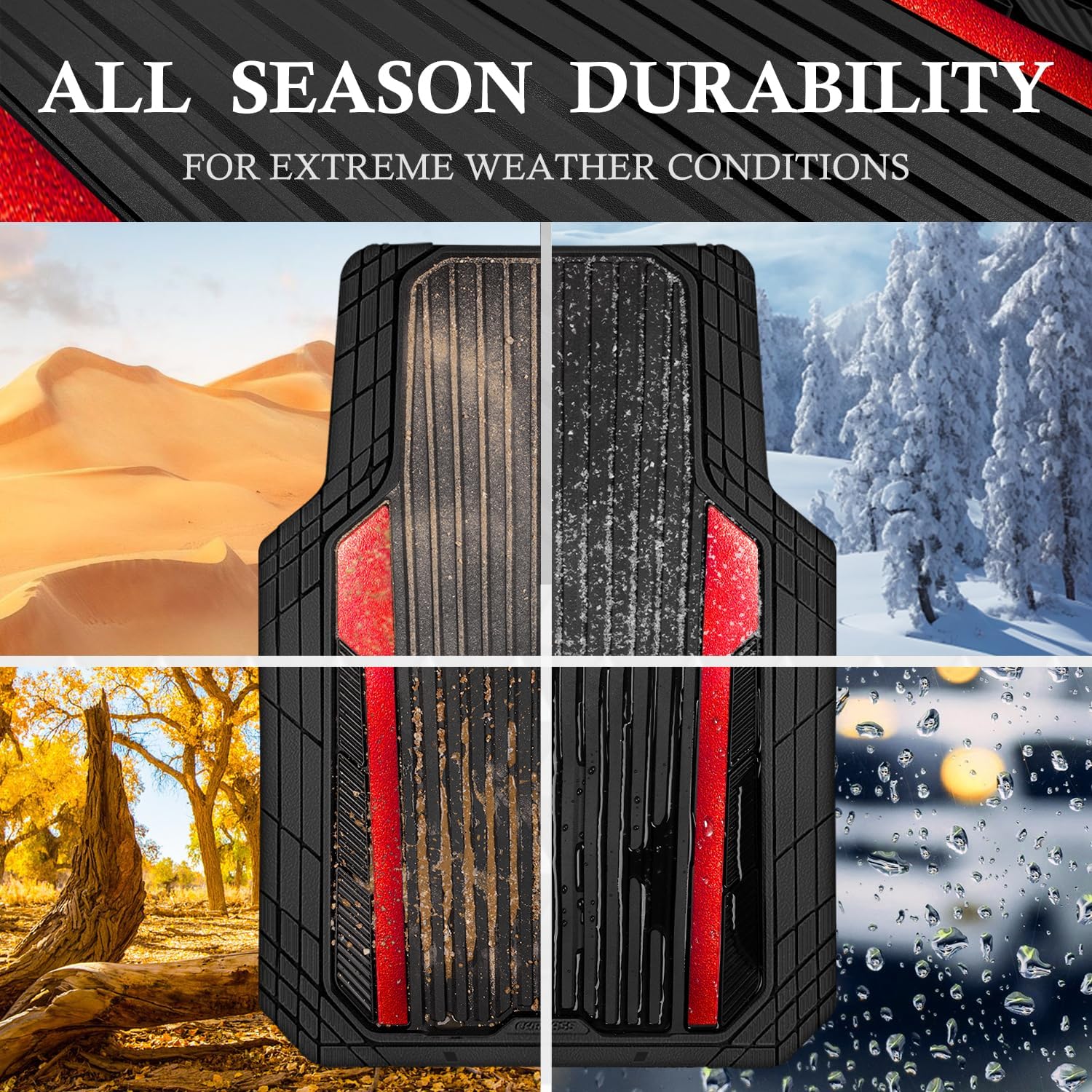 CAR PASS Heavy Duty Rubber Car Mats Metallic S~L Size, Aluminum Film All Weather Floor Mats Waterproof Universal Trim to Fit SUV Sedan Van Truck 4 Piece Deep Dish Two-Tone Sporty Black Red Chrome