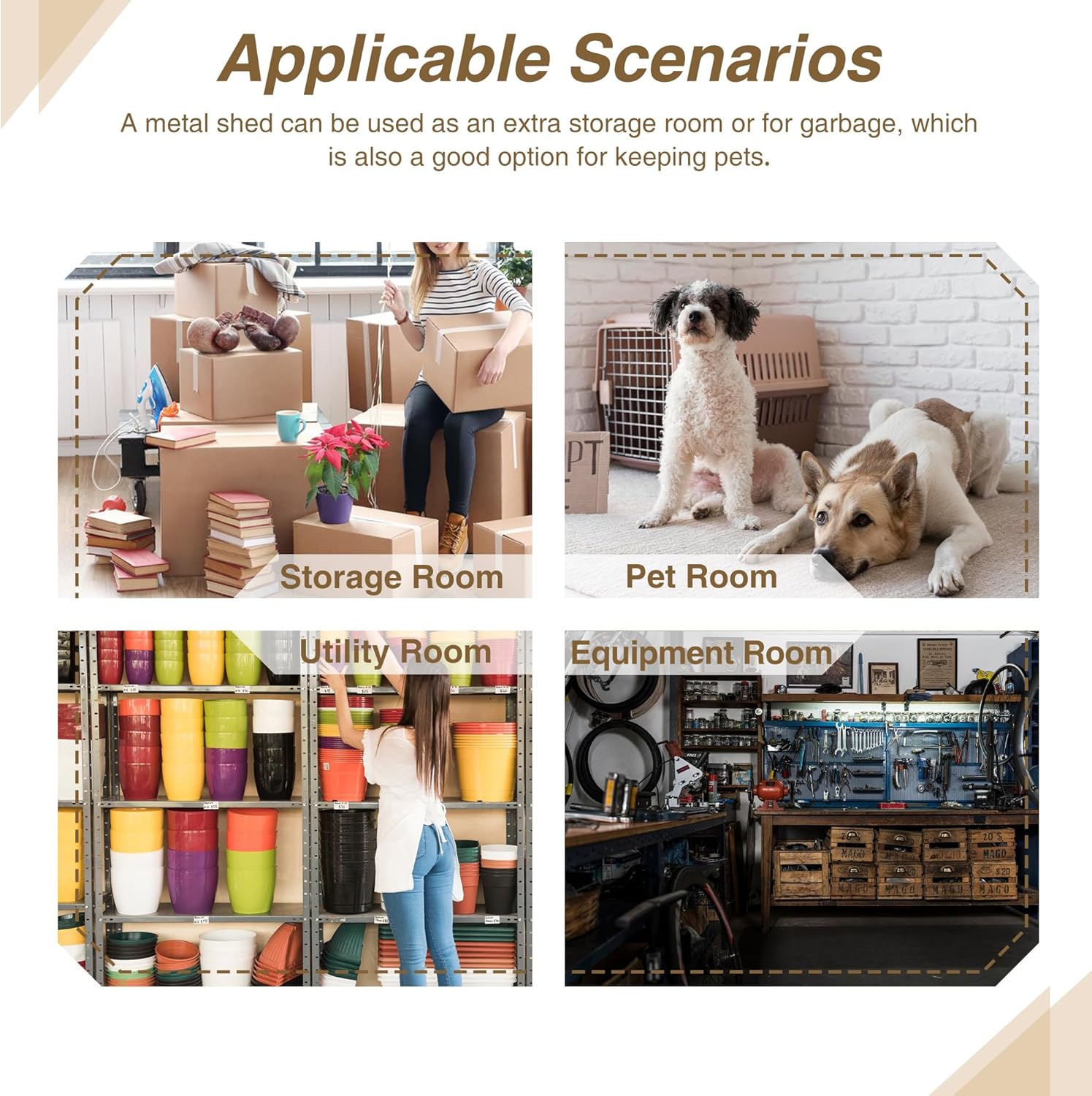 - 【Multi-Purpose Storage Shed】This versatile 8 x 6 feet shed provides ample storage space, perfect for housing items like bikes, lawnmowers, ladders, and tools. It can also serve as a comfortable pet room or a convenient garbage chamber.