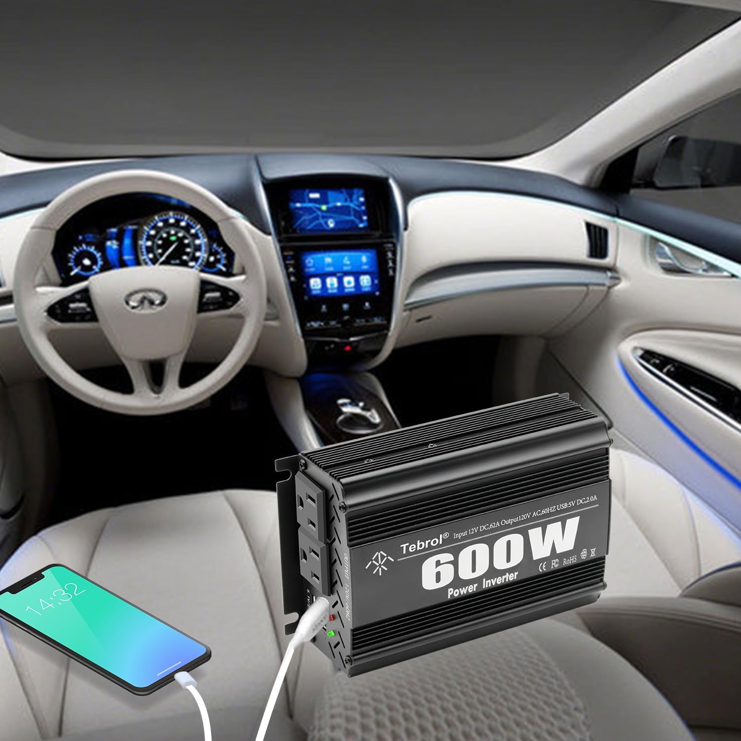 - {600 watt inverter}: Provide 600 watt continuous DC to AC power supply and 1200 watt instantaneous power supply, equipped with 2 AC sockets and 2 USB ports