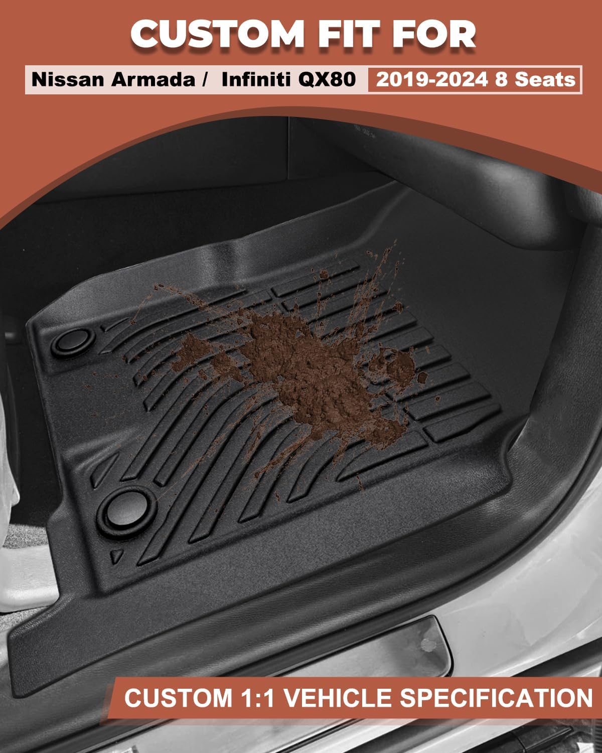 - Perfect Custom Fit: Specifically designed for 2019-2024 Nissan Armada and Infiniti QX80 models, these floor mats are crafted using advanced 3D laser scanning technology for a precise fit. Includes 1 driver-side mat, 1 passenger-side mat, and 1 second-row mat, ensuring complete coverage and protection for your vehicleâs front and second-row footwell.
