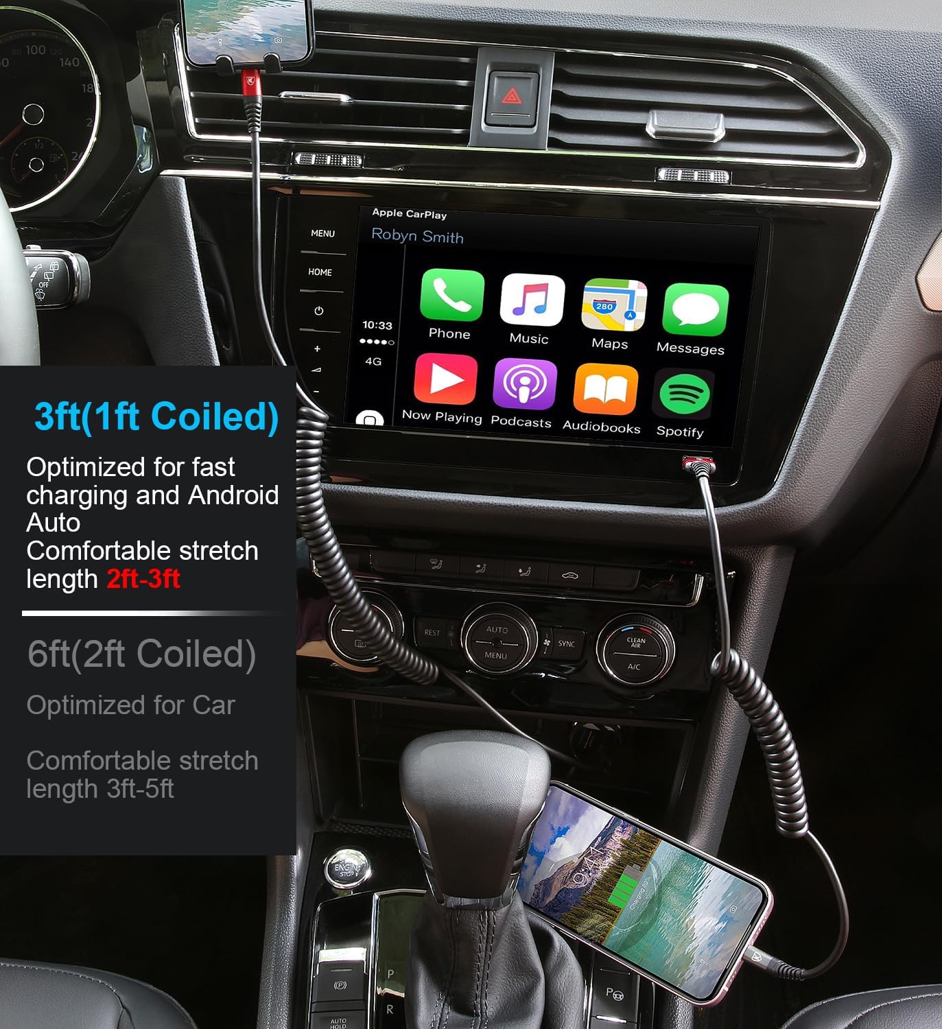 - Elastic Coiled Lightning Cable : Coiled lightning cable 3FT (stretchable to 4.8FT, comfortable stetch length 2ft-3ft) coiled lightning cable 6FT (stretchable to 6.5FT, comfortable stetch length 3ft-5ft) and bounce back to normal length. If you use CarPlay and store your iPhone in a cubicle, we recommend using 3ft; if you use your device lying on the couch while you are charging, you can choose 6ft. iPhone charging cable 3ft and 6ft can meet your different needs.