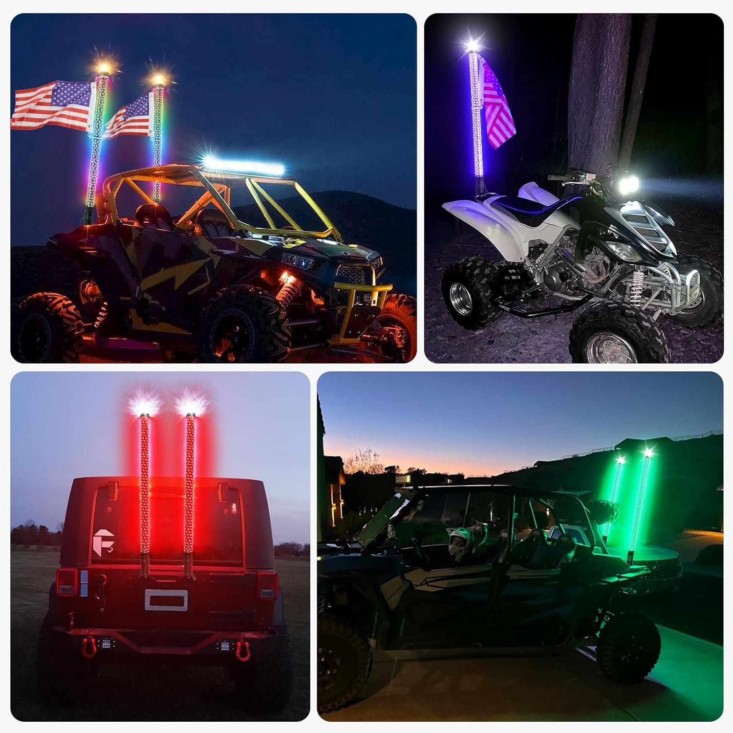 - ăEasy InstallationăOur the led whip light utv whip lights is very easy to install.Drill a hole to secure the LED whip, loosen the base, install it into the hole, then attach the whip light to the base, and connect the power cord in a few easy steps,finally you can control it effortlessly using the remote controller.Manual and installation accessories is included.