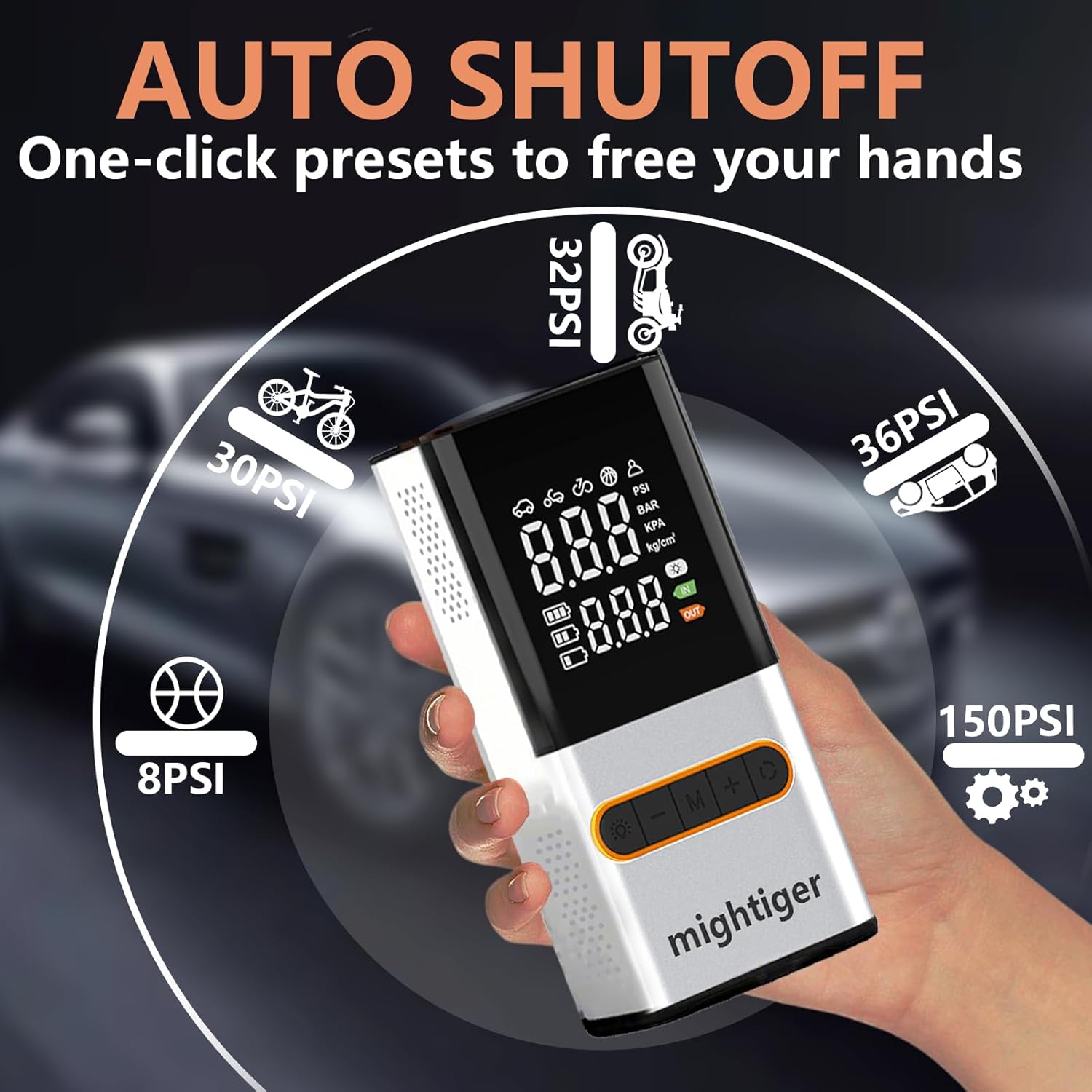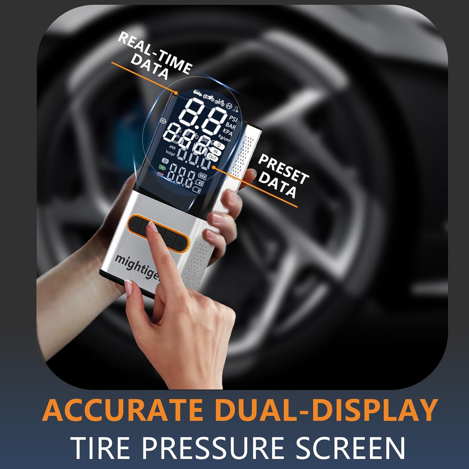 - Dual-Power:MIGHTIGER Tire Inflator allowing you to use it with a car charger or its built-in rechargeable batteries. It can also be used as a power bank, making it super handy for emergencies and everyday use.