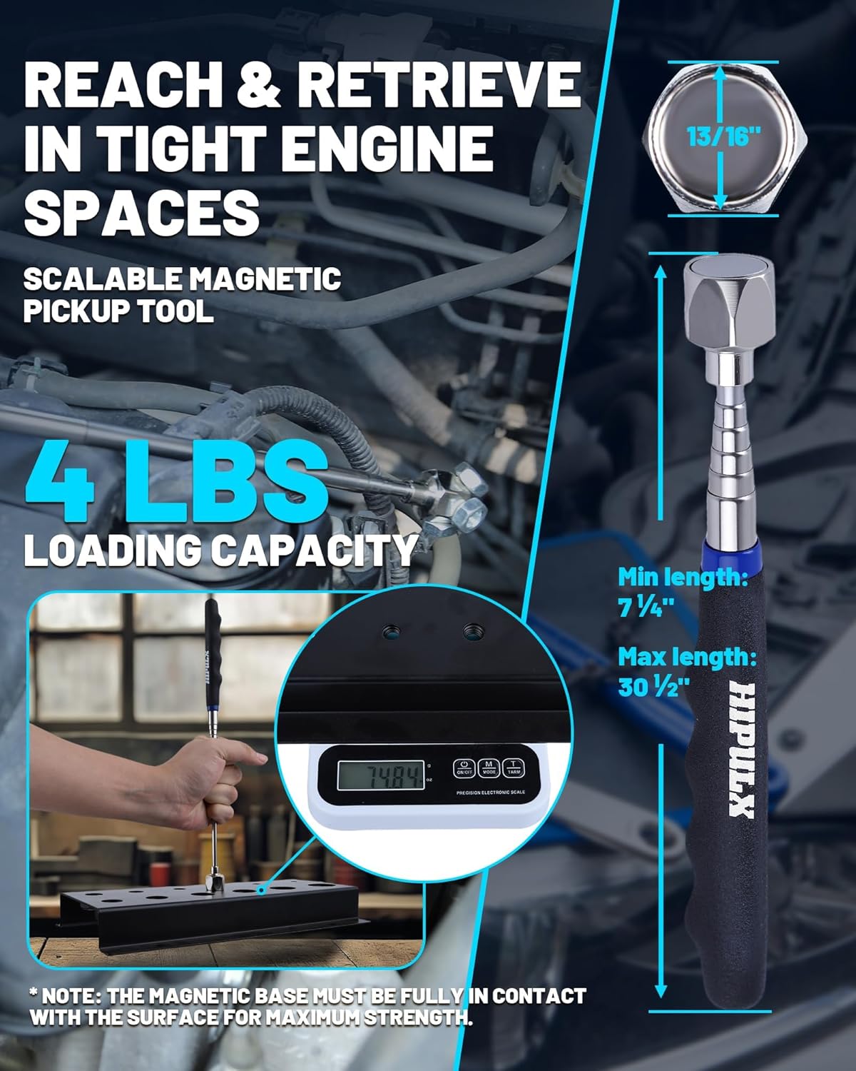 - Mobility Focused: Compact pickup extends to 30.5" for overhead/engine work; 1680D OXFORD FABRIC magnetic wristband frees hands during repairs.