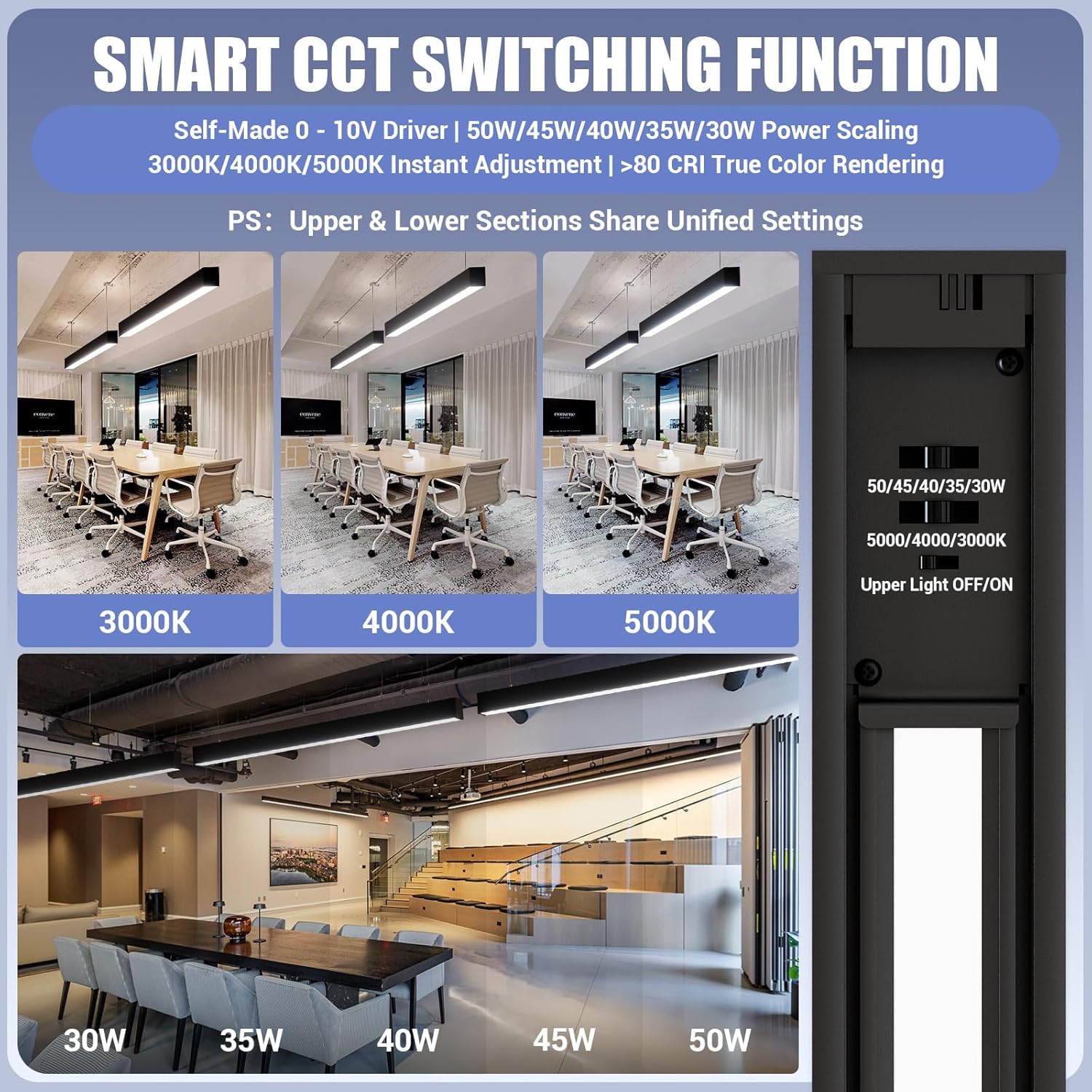 - DIRECT AND INDIRECT LIGHT:LED linear light fixture is innovated with 50/45/40/35/30W down light and 50/45/40/35/30W up light. The down light provides sleek focused lighting and the up light creates a nice ambiance and reduce eye fatigue, perfect for office, work bench, work shop, garage, gym, school, exhibition, bar,and even pool tables.