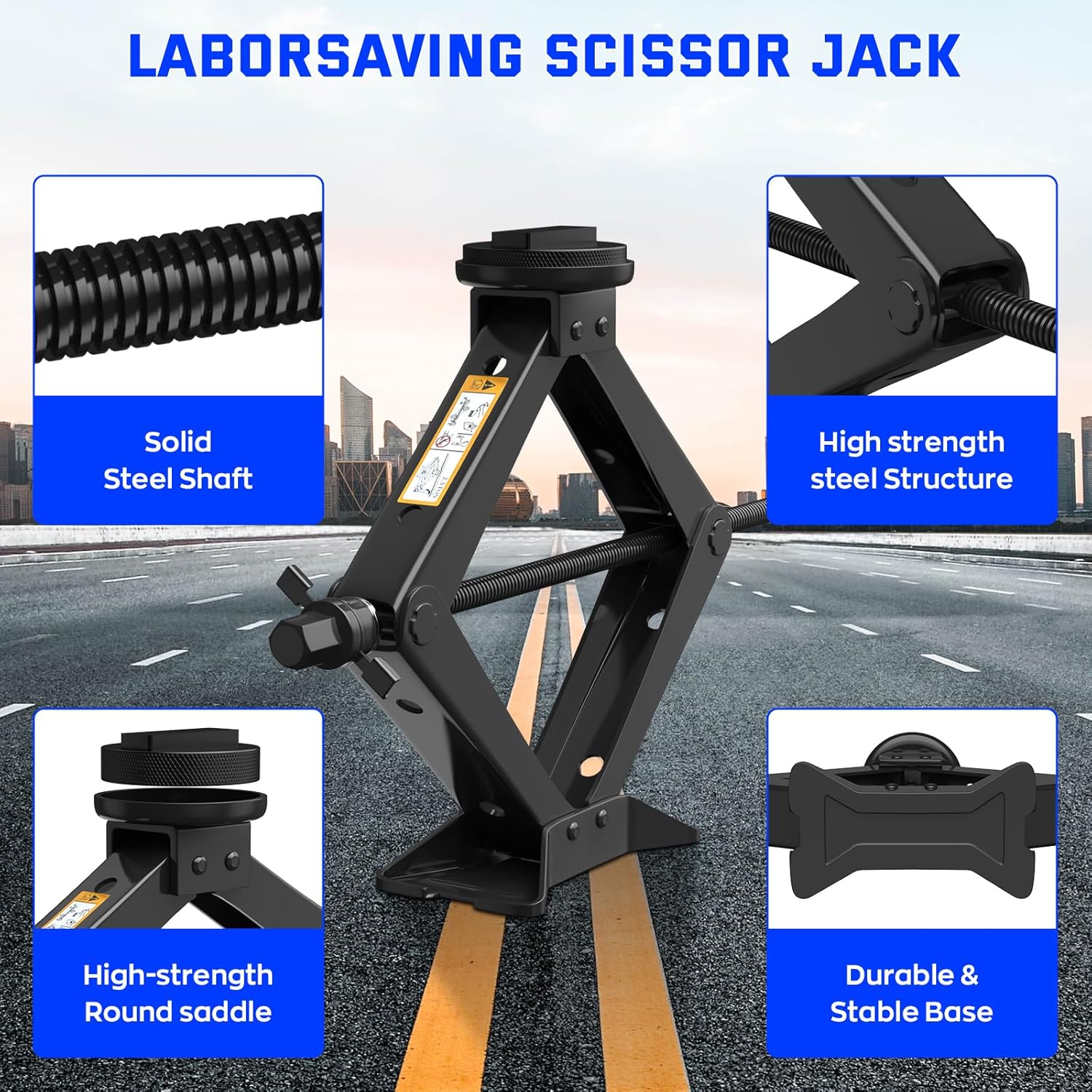 - 【Easy to Operate】The scissor jack has a simple and easy-to-operate design, while the lug wrench and tire changing kit are designed to provide a comfortable grip and maximum leverage.this car jack kit is a must-have for any roadside emergency tire change.