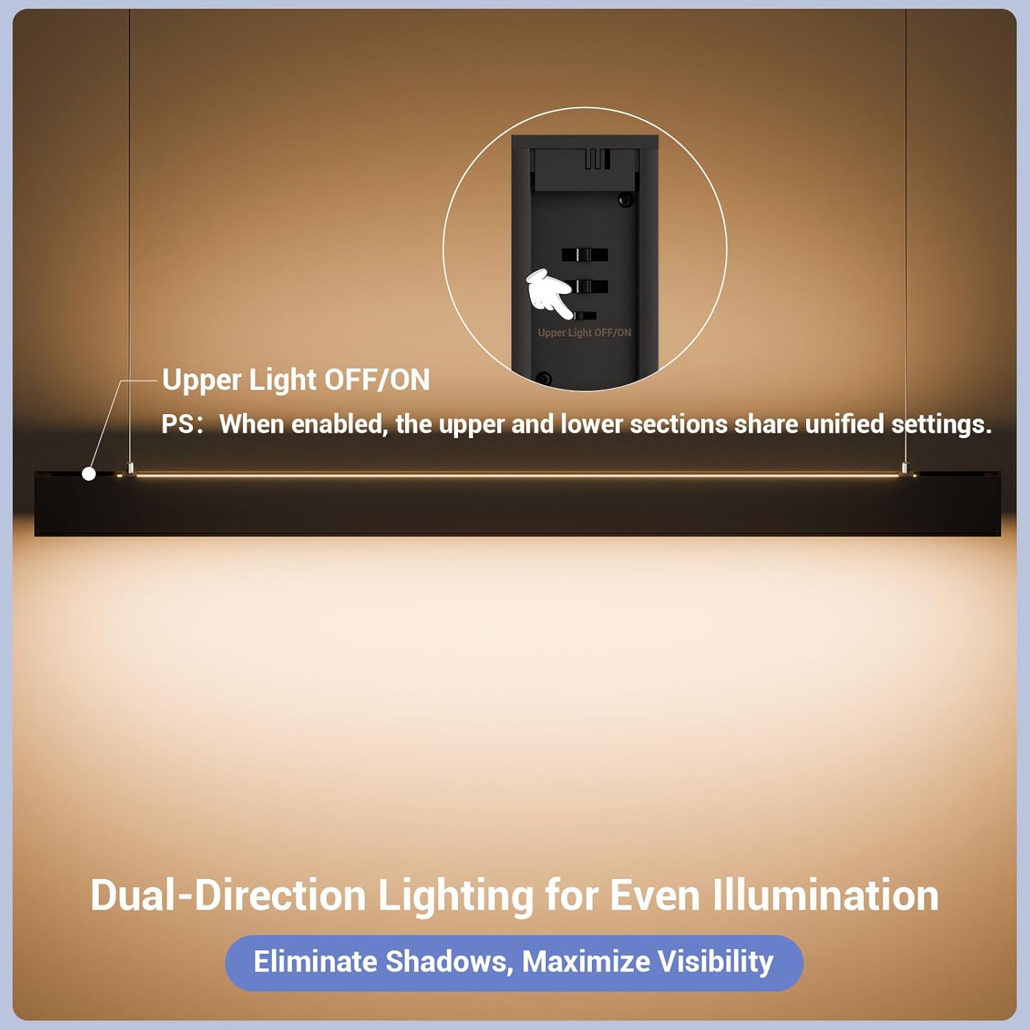 - DIRECT AND INDIRECT LIGHT:LED linear light fixture is innovated with 50/45/40/35/30W down light and 50/45/40/35/30W up light. The down light provides sleek focused lighting and the up light creates a nice ambiance and reduce eye fatigue, perfect for office, work bench, work shop, garage, gym, school, exhibition, bar,and even pool tables.
