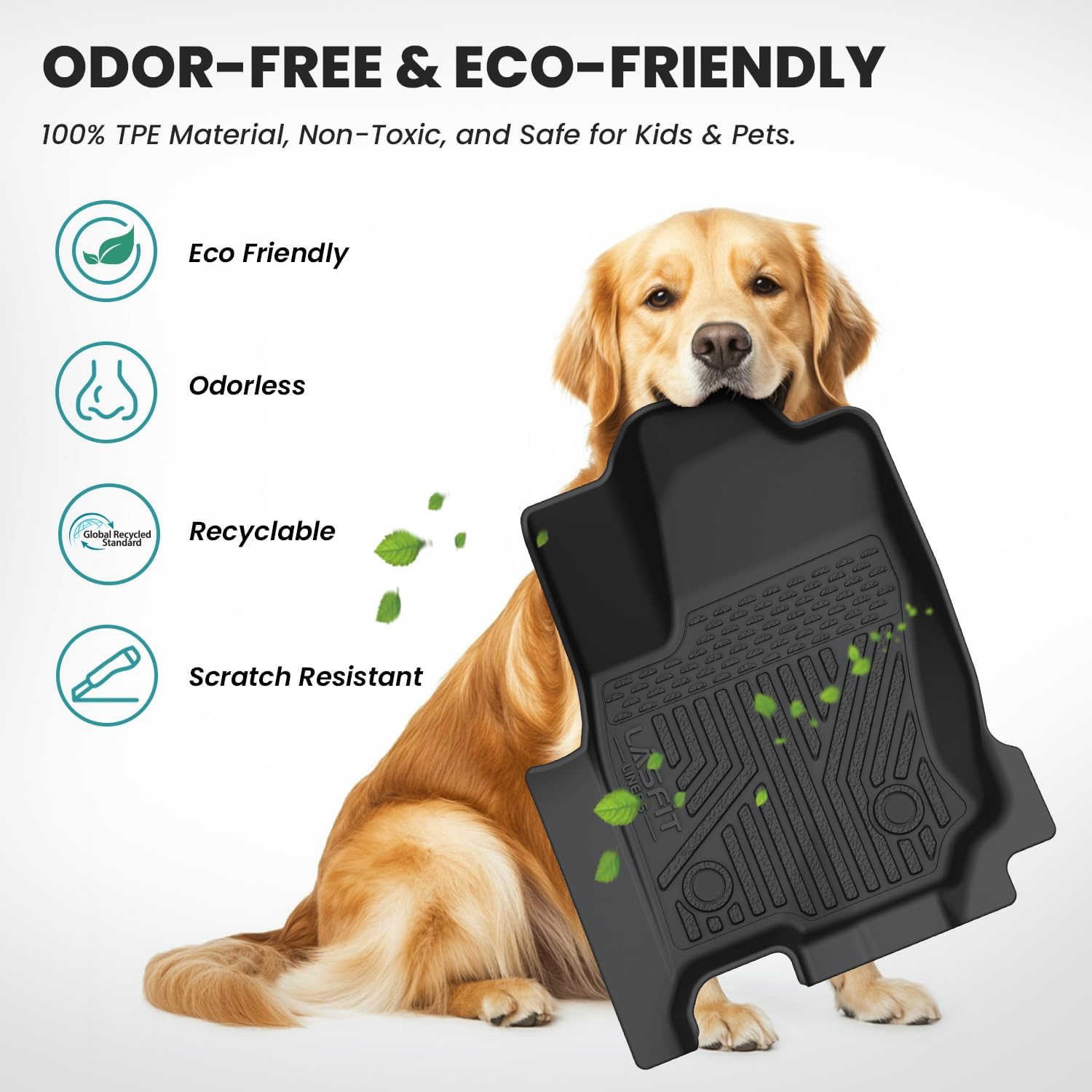 - ENVIRONMENT FRIENDLY- The All Weather 4 runner mats use elastic TPE (Thermoplastic Elastomer), No foul odor is produced even at high temperatures. soft touch and exquisite finish. The Lasfit 4 runner floor mats are skid-proof and recyclable.