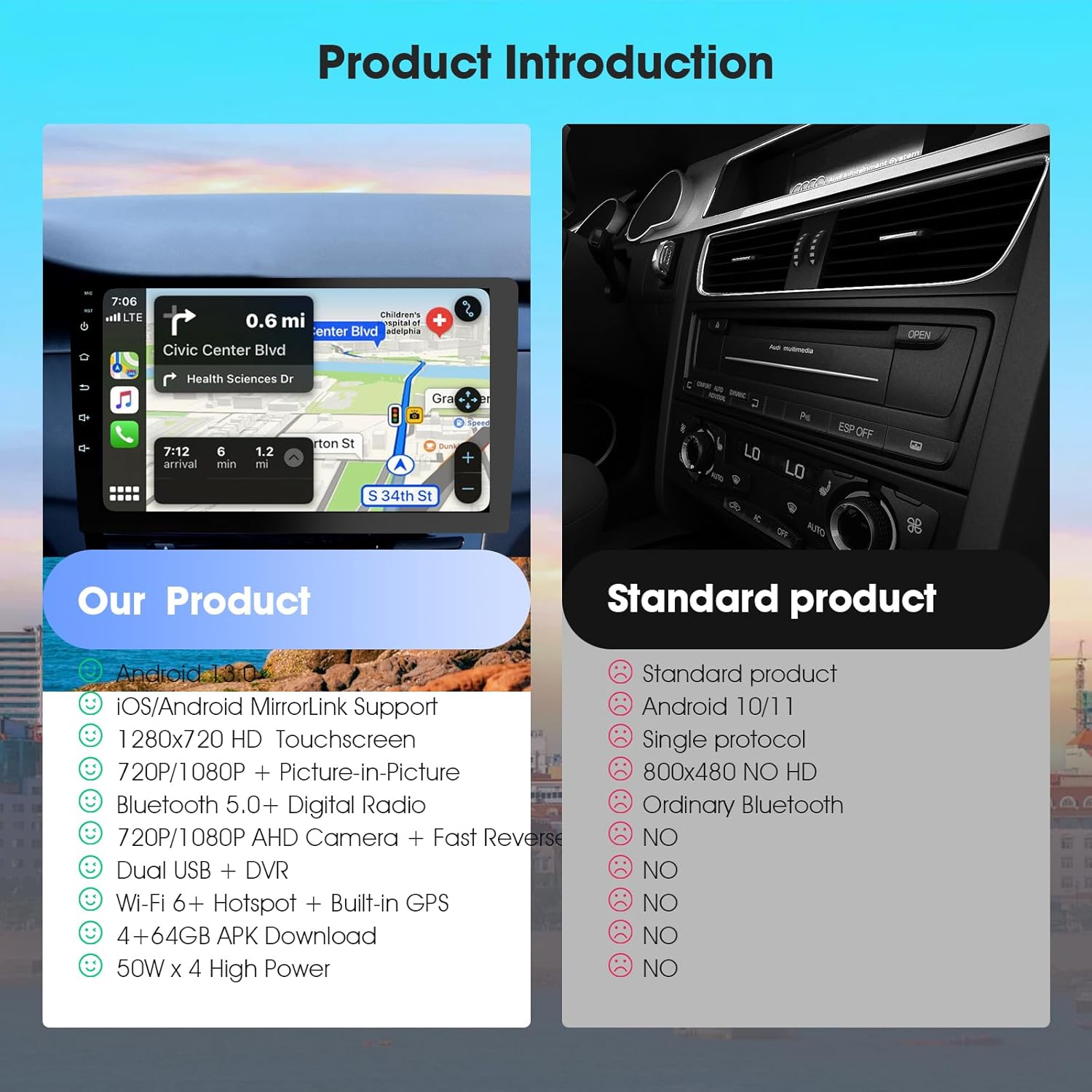 - 【Crisp HD Display for Multitasking】A vibrant 720P LCD screen supports CarPlay visuals, video playback (720/1080P), and picture-in-picture mode, ideal for navigation and media simultaneously.