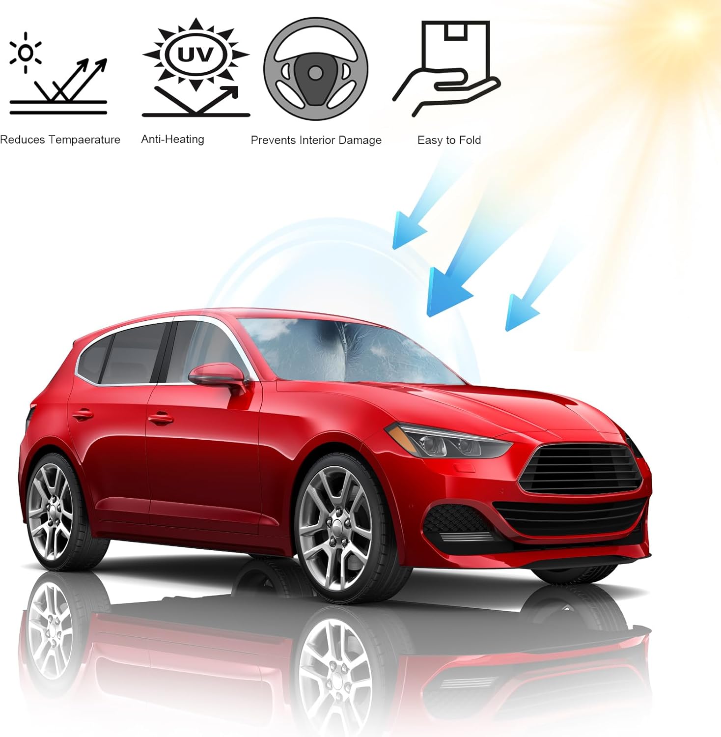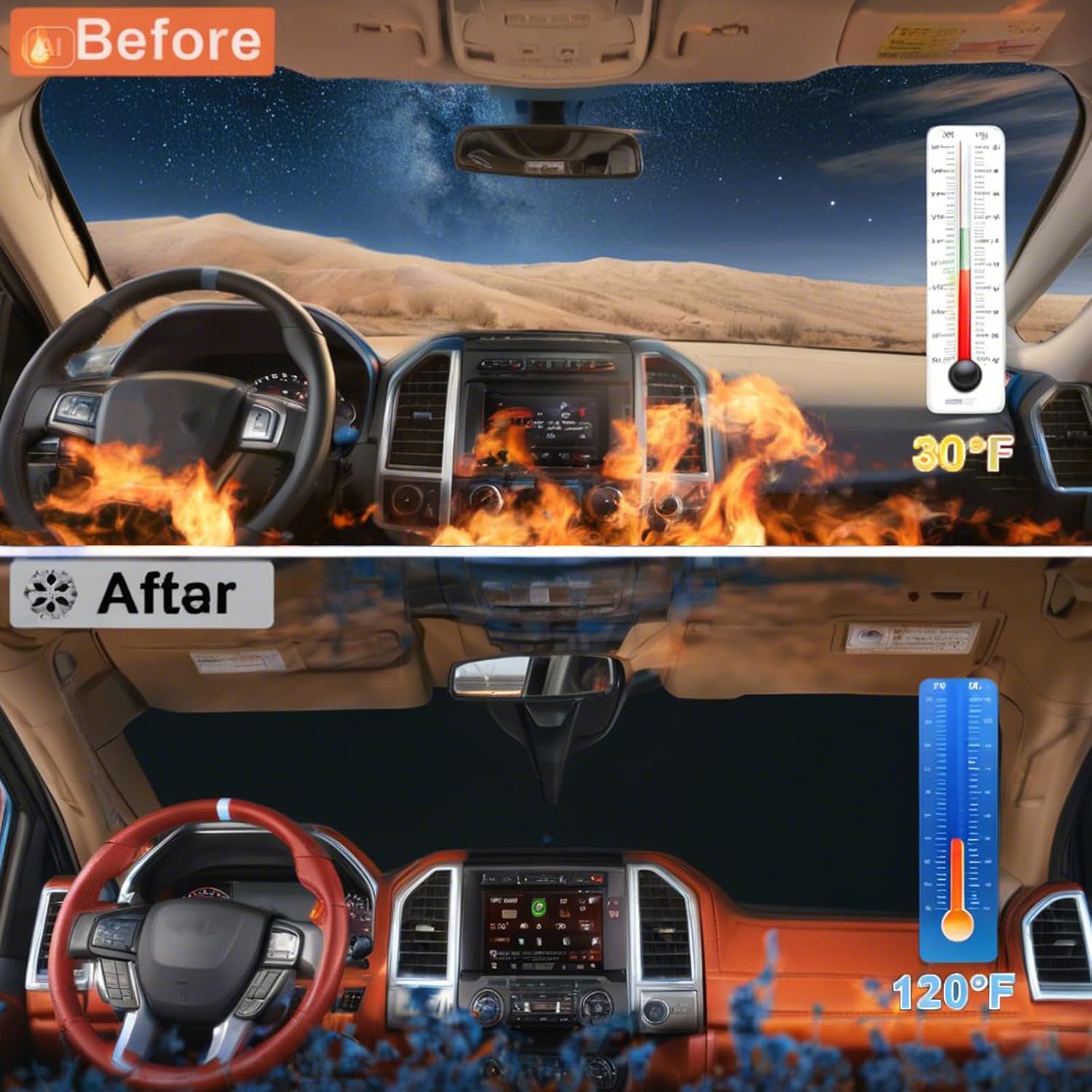 - Perfect Fit:The front windshield sun shade perfectly match for Ford F150, F250, F350, Raptor, Escape, and Expedition windshields 1996-2025. The reinforced steel-frame edges ensure a snug, gap-free fit, preventing sunlight leakage and maximizing heat reflection.