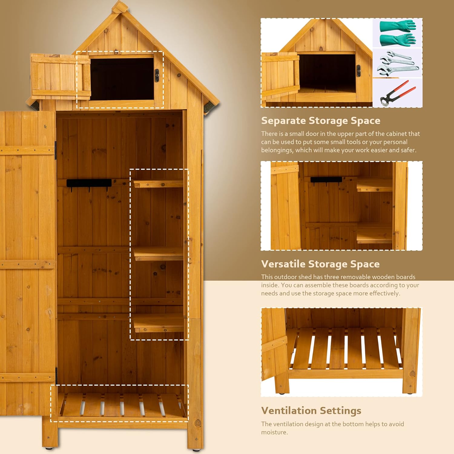 - Sturdy Construction - Built with 100% solid fir wood, this storage shed is reinforced with extra wood boards for enhanced durability. The raised bottom protects against uneven ground, ensuring stability and longevity.