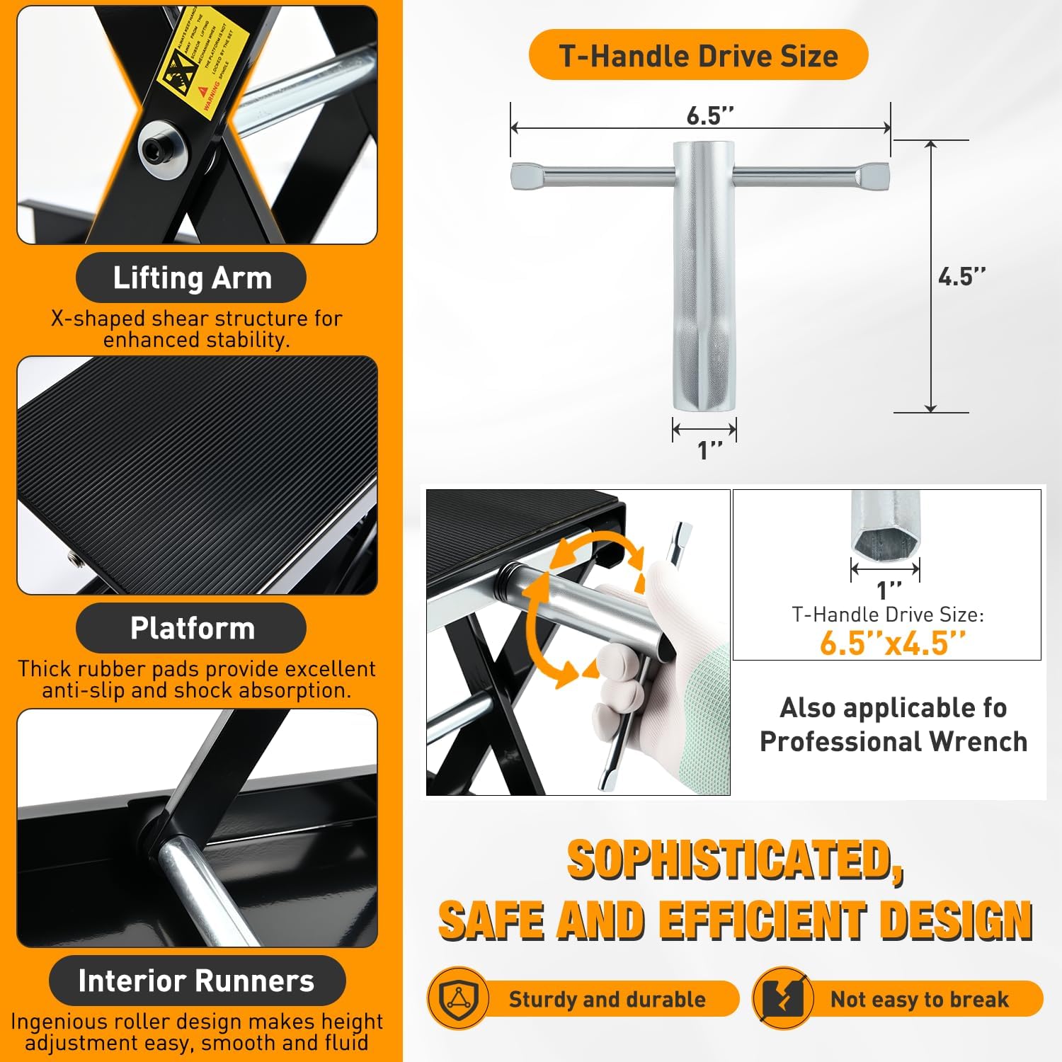 - ENHANCED BEARINGS: With a one-piece steel structure at the bottom slider and a longer thicker connection between the handle and the center rotating shaft, it ensures the longevity of the motorcycle stand lift. Scissor lift jack can be used to lift various types of motorcycles, including street bikes, cruiser bikes, and adventure touring motorcycles