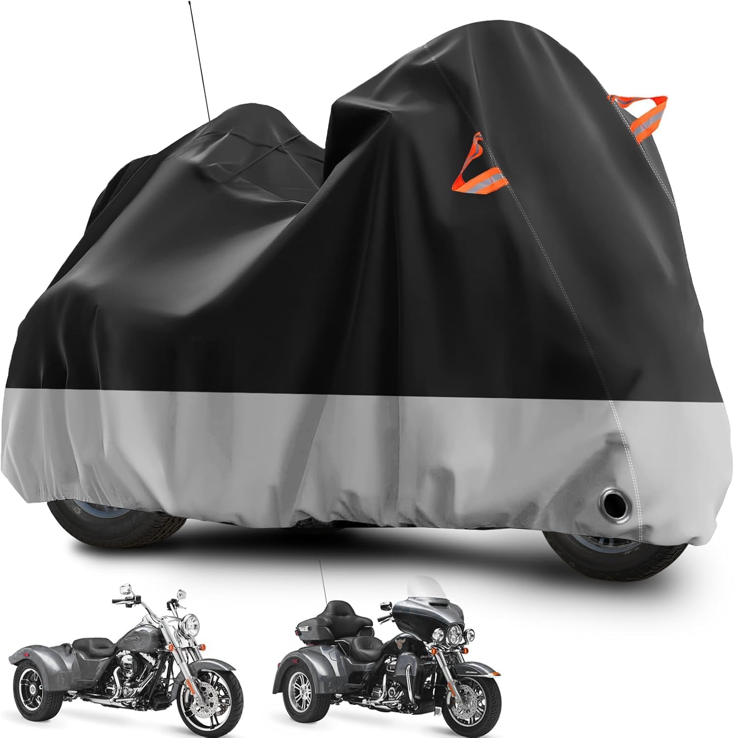 Trike Motorcycle Cover, Outdoor Waterproof Vehicle Cover with Windproof Buckle Reflective Strip for Harley Davidson, Honda Gold Wing, Kawasaki 3 Wheel Motorcycle Accessories (Black&Grey)