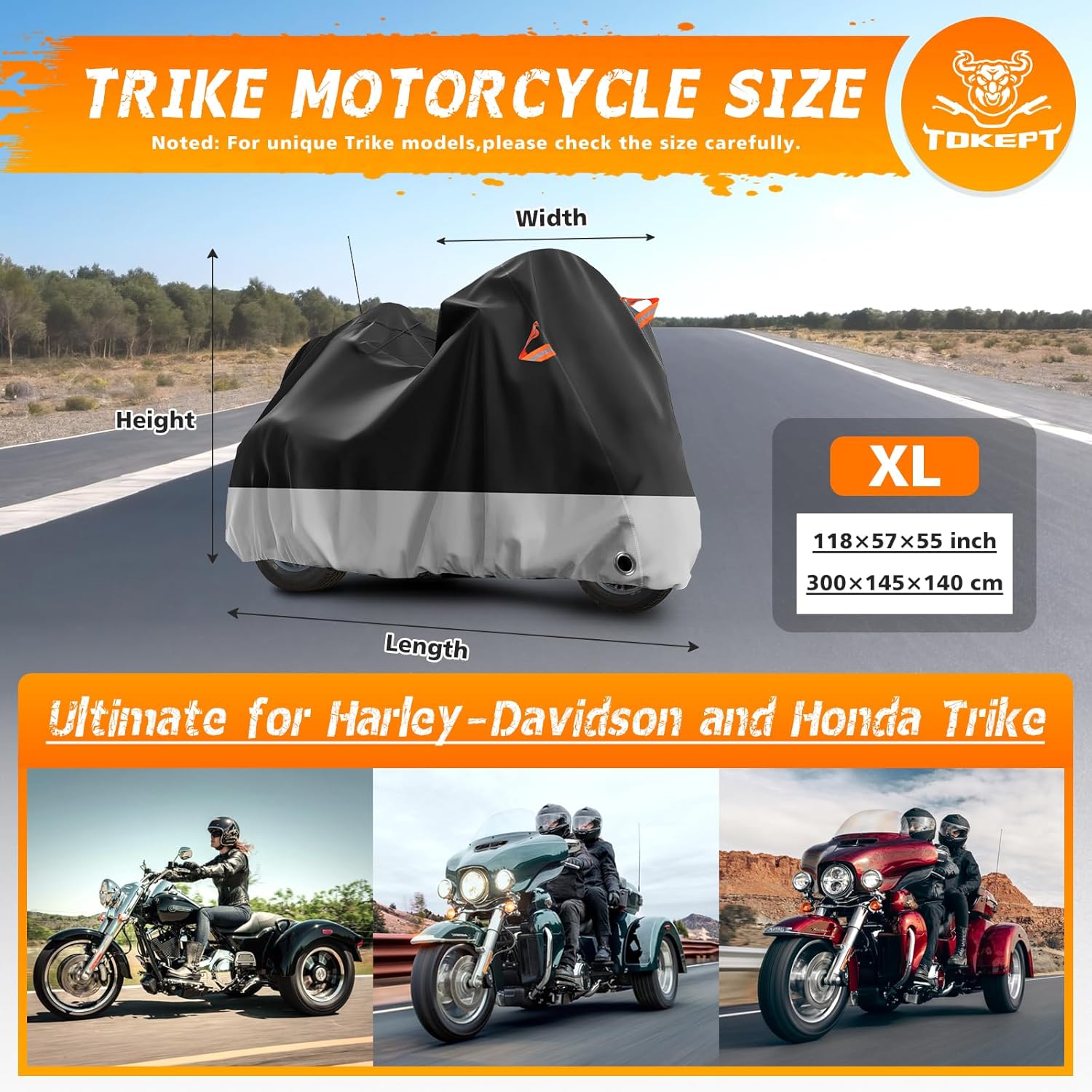 - Universal Fit: 118"L x 57"W x 55"H, Suitable for Harley Davidson Freewheeler, Tri Glide ultra and CVO trike version, Honda Goldwing trike, Rewaco trike, Kawasaki trike and many more