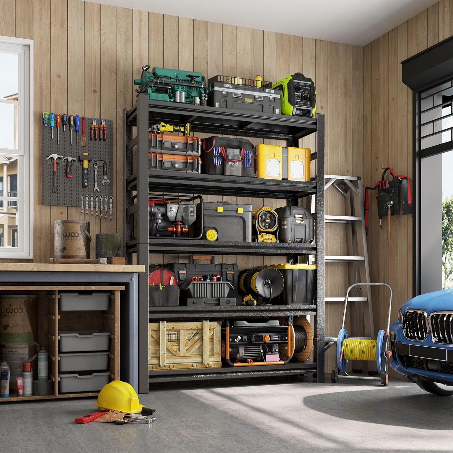 - 【UPGRADED SAFETY PROTECTION】Each shelf of our garage shelving is equipped with specially designed fall prevention safety rails, which effectively prevents items from accidentally falling and greatly reduces the chance of items tipping over and rolling to the ground in busy places such as garages and workshops where items are prone to collisions or bumps. Meanwhile, garage shelving adopts upgraded double-layer columns, which significantly improves stability and load-bearing capacity.