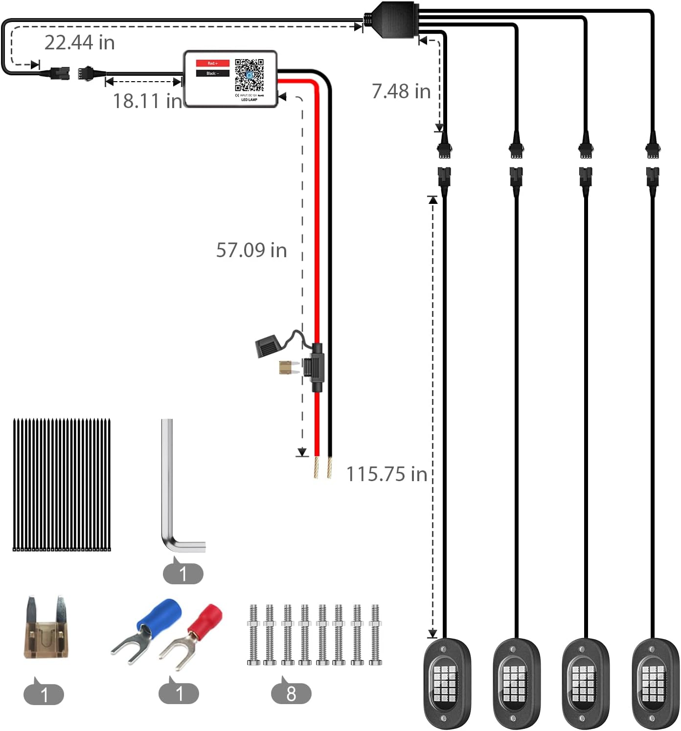 - â¶ăExtra Wiring for Added LengthăThis RGB rock lights kits includes extra wiring length for different vehicles. The length of each pod cords is about 118 inches. If your car is large, you may need to purchase additional extension cables. Purchase Rock Light Extension Wire ASIN: B0BL72N5XW