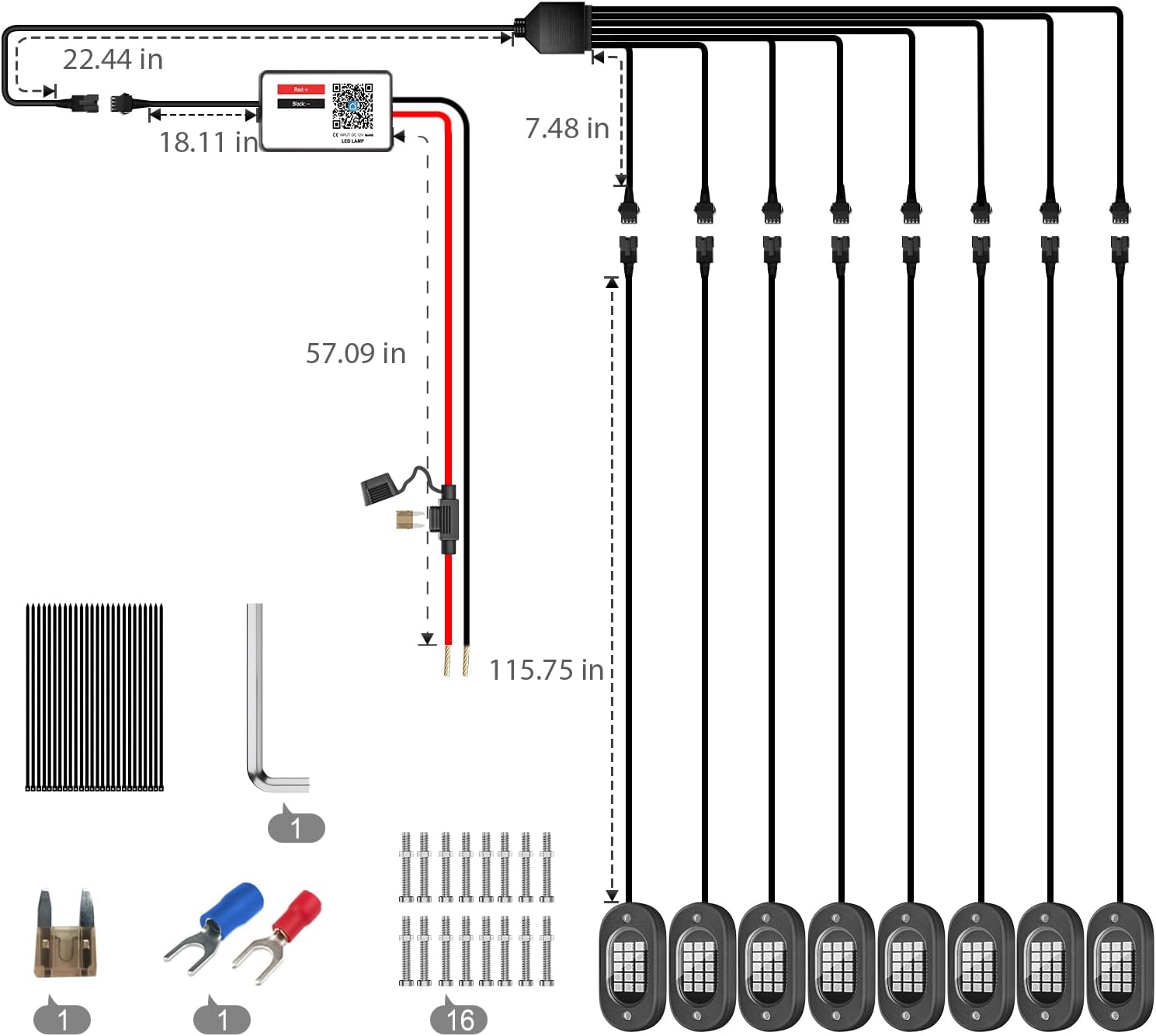 - Included Components : RGB Rock Lights Pods, Control Box, Heat Shrink Wire Connectors, Fuse Holder, Blade Fuse, Zip Ties, Screws, Allen Wrench RGB Rock Lights Pods, Control Box, Heat Shrink Wire Connectors, Fuse Holder, Blade Fuse, Zip Ties, Screws, Allen Wrench