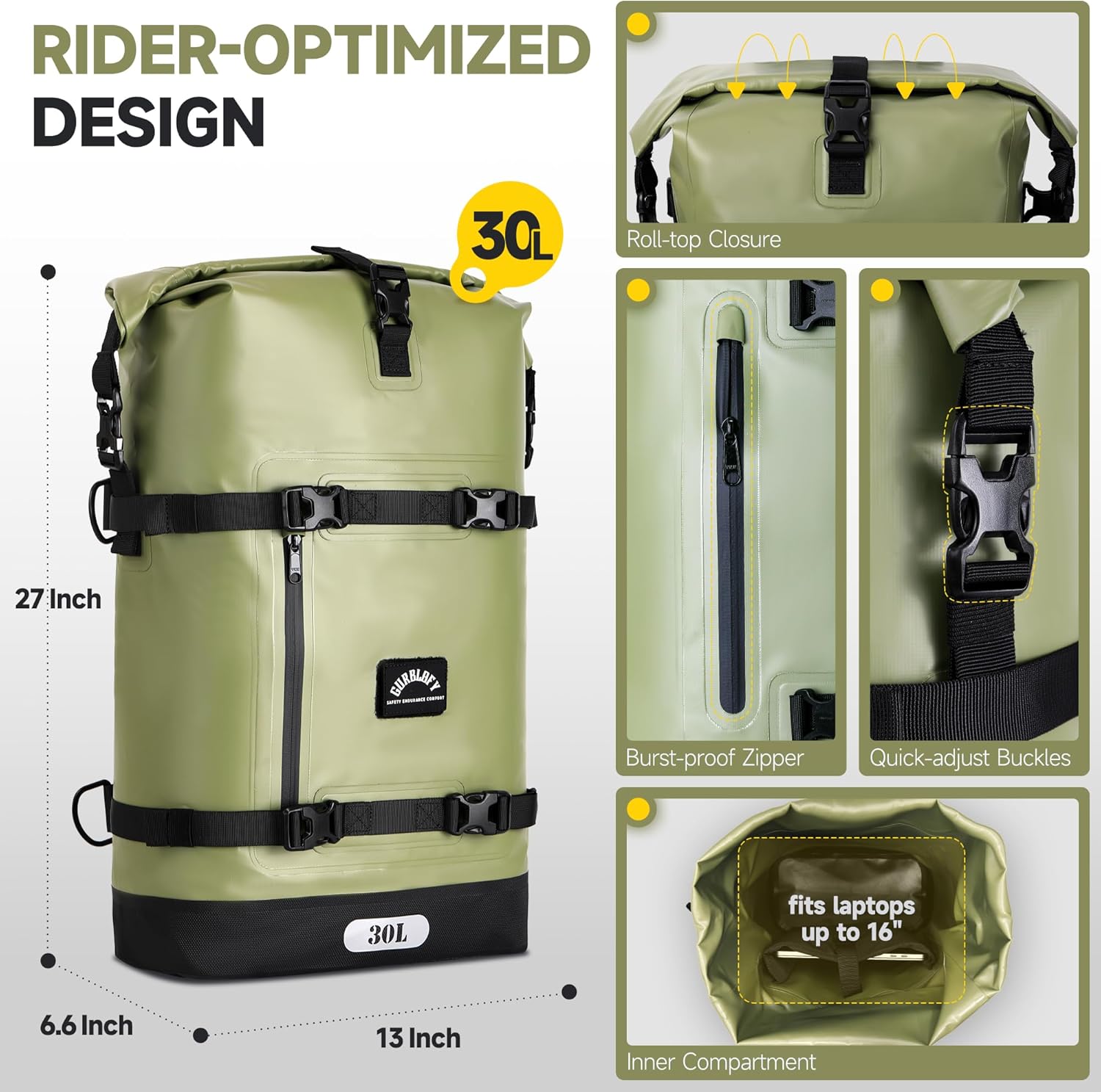 - Rider-Optimized Functional Design. The Gurblofy motorcycle tail bag is engineered with the rider in mind: Its heavy-duty PVC construction withstands all weather conditions, while storm-proof zippers ensure secure closure. The pack features quick-adjust buckles for instant sizing, and our patented textured handle design delivers a firm grip even with gloves. Multi-position straps distribute weight evenly across your back for fatigue-free riding adventures.