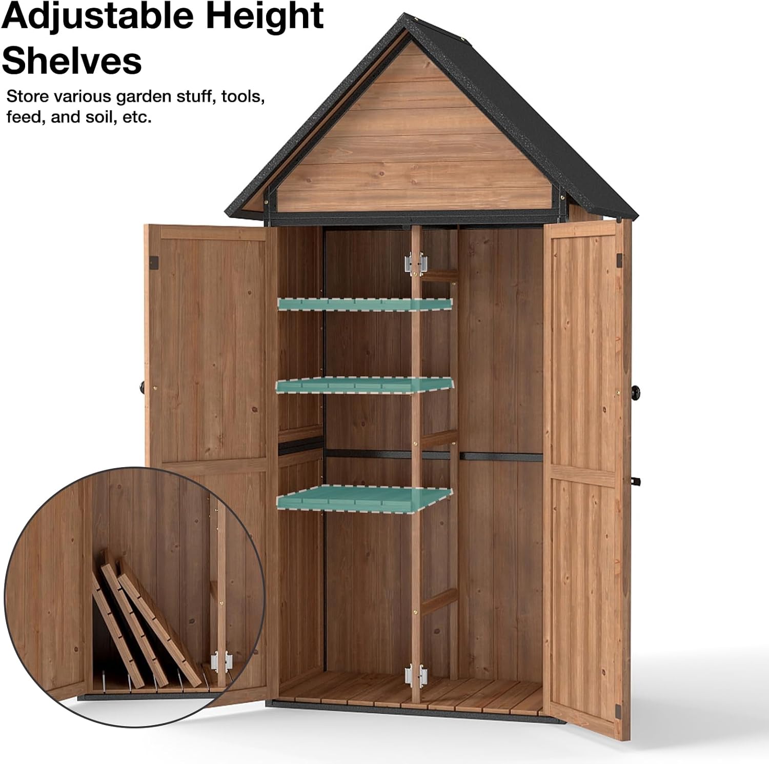 - Weatherproof & Elevated Design β The garden storage tool shed features a sloped roof to prevents rainwater pooling and raised fir floor blocks moisture, keeping tools dry in any season.