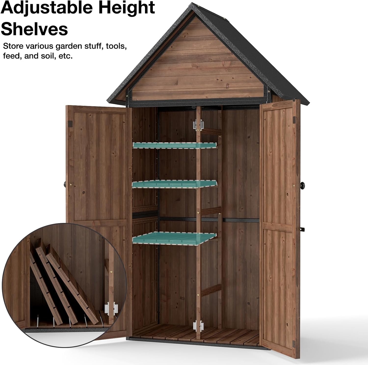 - Weatherproof & Elevated Design β The garden storage tool shed features a sloped roof to prevents rainwater pooling and raised fir floor blocks moisture, keeping tools dry in any season.