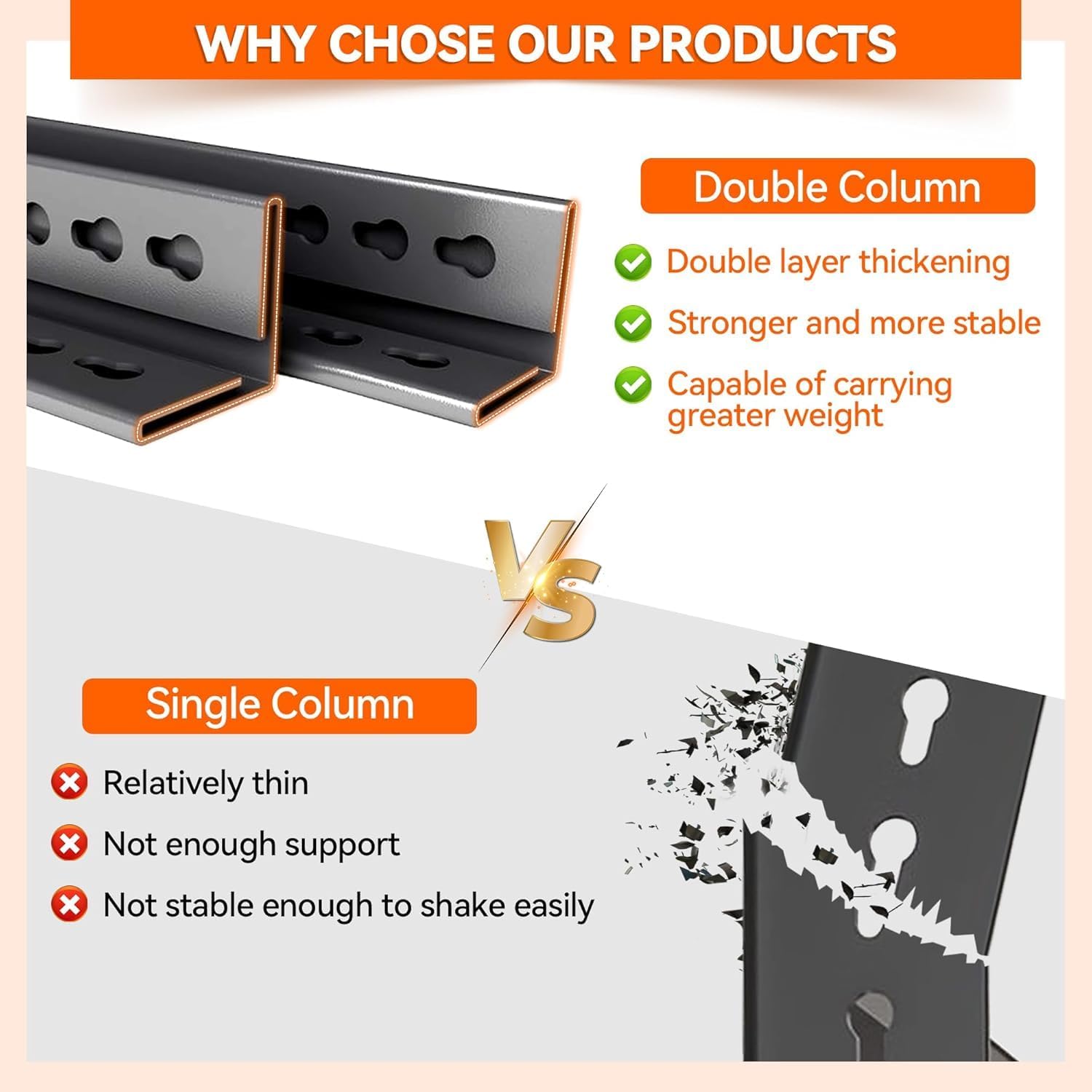 - ă Upgraded Dual-Layer Columns for Enhanced Stabilityă Unlike standard shelves on the market that use single-layer columns, our product features upgraded dual-layer columns that significantly boost stability and load-bearing capacity. The reinforced structure helps distribute the weight evenly, reducing the risk of warping or sagging over time. This ensures the shelf remains stable even under heavier loads. In comparison, shelves with single-layer columns can wobble or bend when storing heavier items, making them less reliable for larger, bulkier tools or materials
