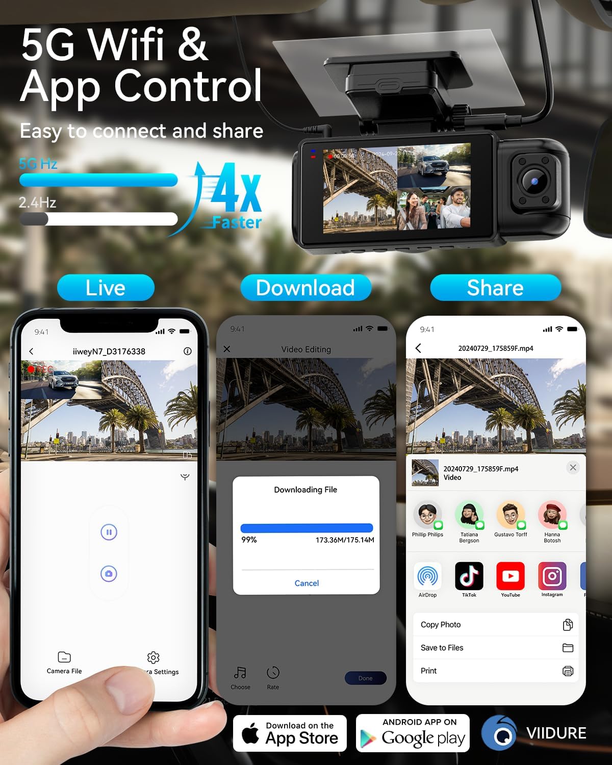 - ă5G WiFi & Easy Phone ConnectionăEnjoy high-speed 5G WiFi for ultra-fast downloads, reaching speeds up to 8MB/s (compared to just 2MB/s with 2.4GHz WiFi). Stream live video from your dash camera for cars seamlessly on your phone, adjust camera settings, download footage, and share videos effortlessly on platforms like Instagram, YouTube, and Facebook. You can use the app free and not recomment to pay the subscription fee.