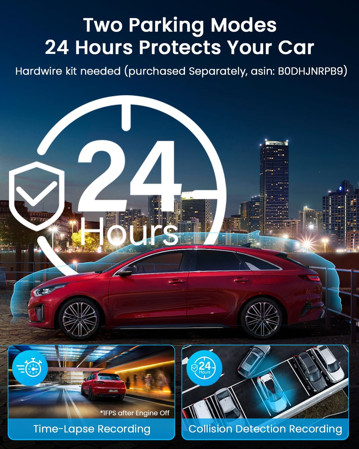 - ă24-Hour Parking ModeăThe dash cam is equipped with a low-bitrate parking mode that enables continuous recording while the vehicle is parked, optimizing storage by reducing video quality. Additionally, the collision detection parking mode automatically triggers recording when an impact is detected. For continuous operation, the 3-channel dash cam must be connected to a hardwiring kit (sold separately, ASIN B0DHJNRPB9).