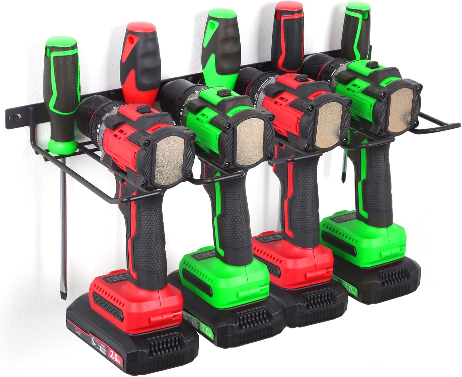 - A Little More Storage: This power tool organizer wall mount can hold 4 cordless drills or other tools, with extra slots allowing you to organize more screwdrivers
