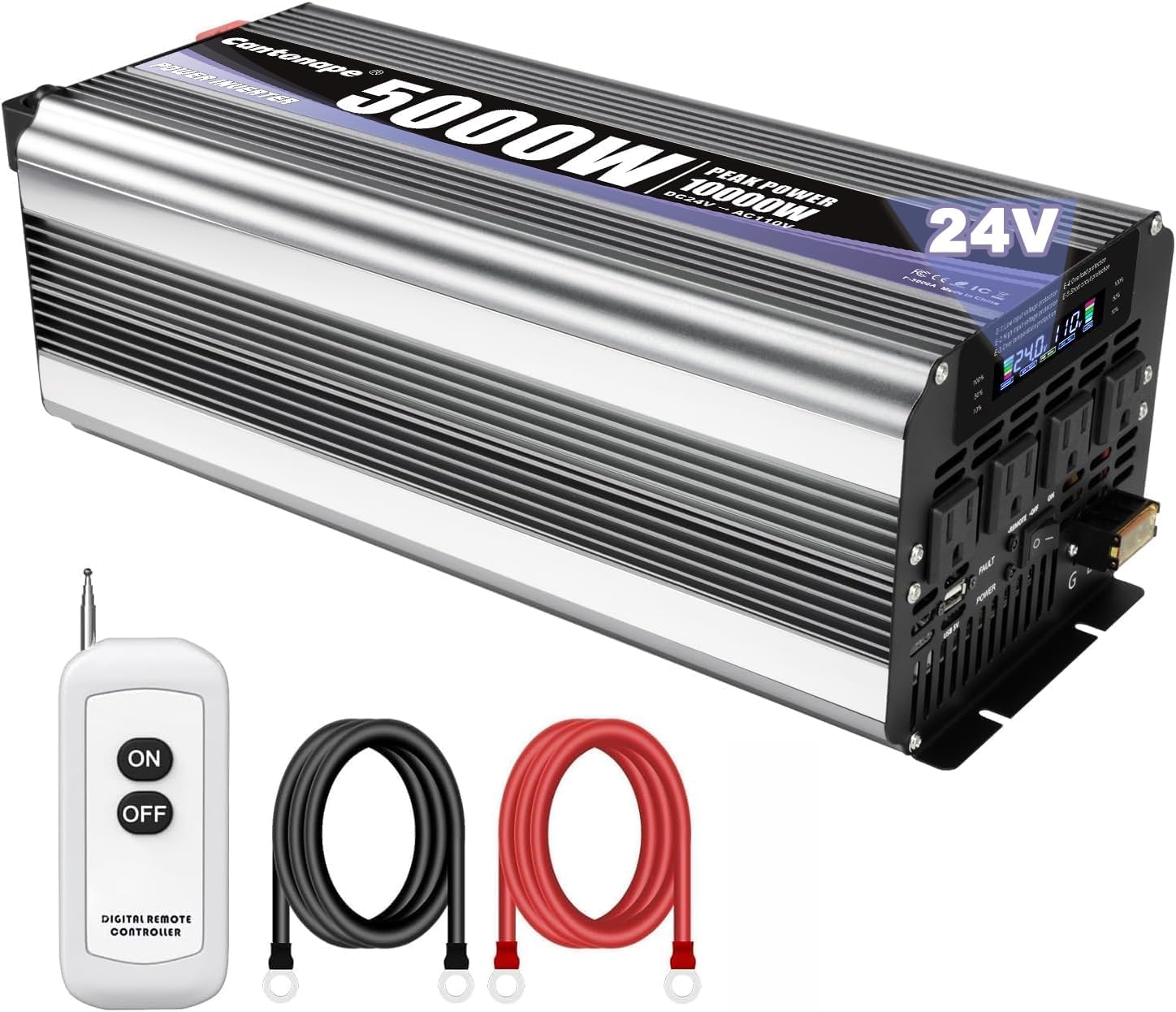 - Powerful Performance: Converts DC 24V to AC 110V/120V with a continuous output of 5000 watts, peaking at 10000W. Equipped with 4 AC output interfaces and a hard-wired connection option.