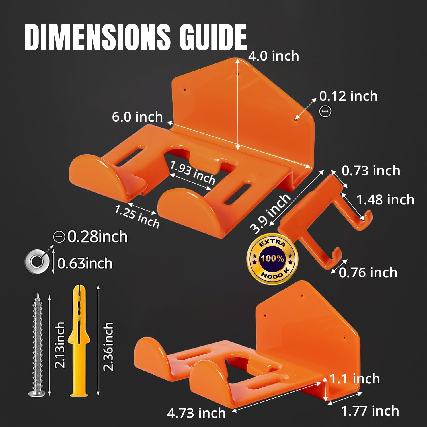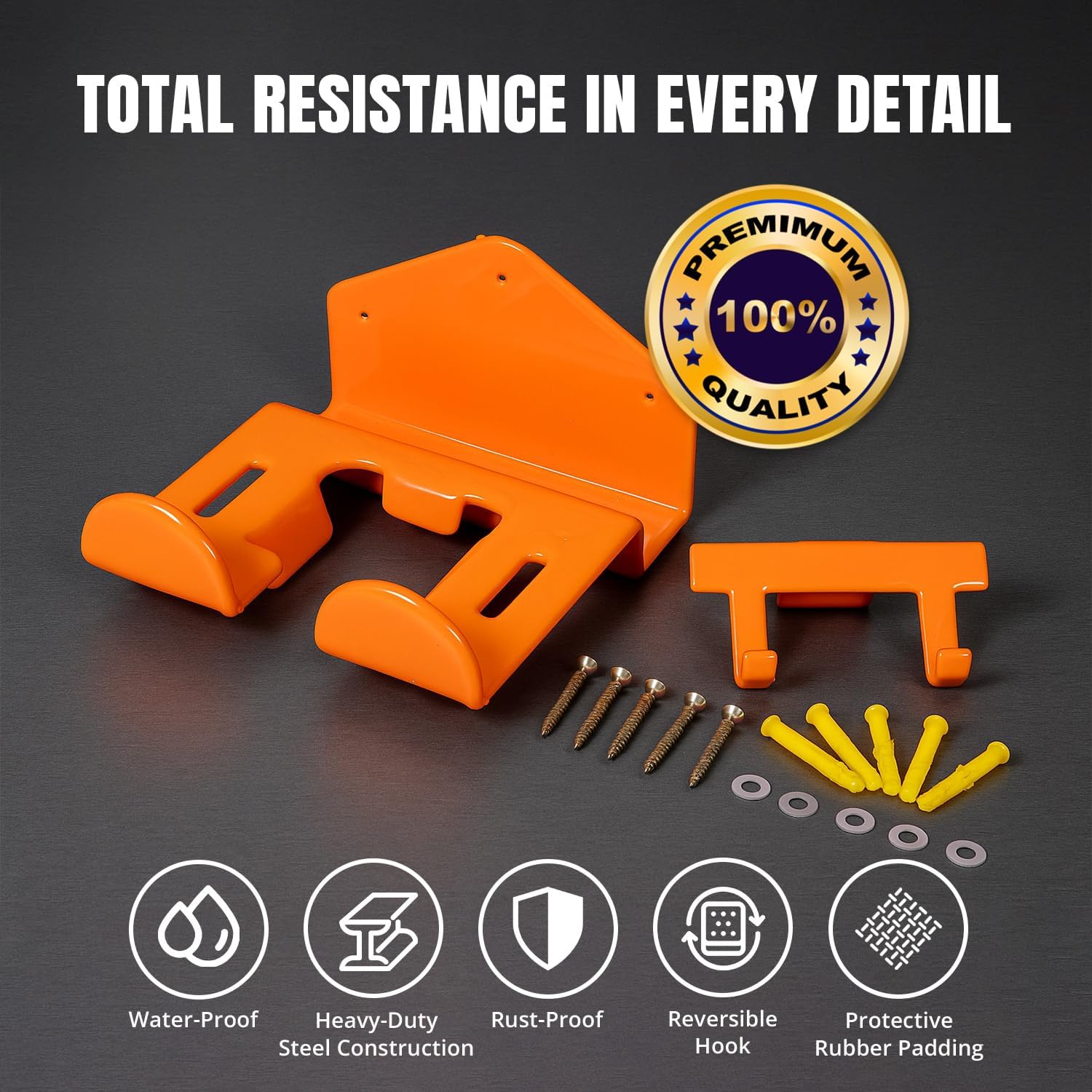- [ PREMIUM QUALITY ] : Crafted from thick gauge steel for superior strength, this garage organizer is built to last. The orange rubber coating protects against rust, chipping, and crackingâideal for lawn equipment storage and power tool hanger needs. Smooth edges prevent damage to gear, making it perfect as garage hooks heavy duty, leaf blower hanger, or weed wacker holder for your garage storage system.