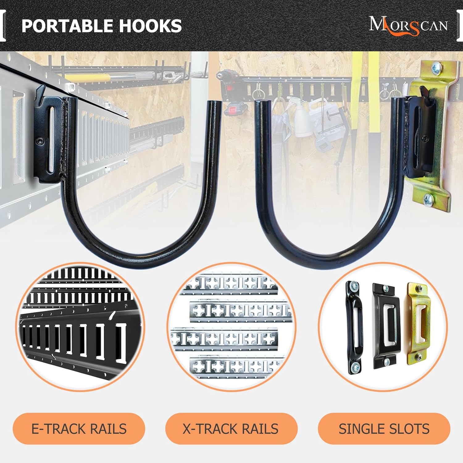 - HEAVY DUTY HOOKS - Strong hooks fit for all E Track/X Track trailer tie-down rails or E port single slots. With 4" inner clearance, 500 pound working load limit, 1,400 pound break strength.