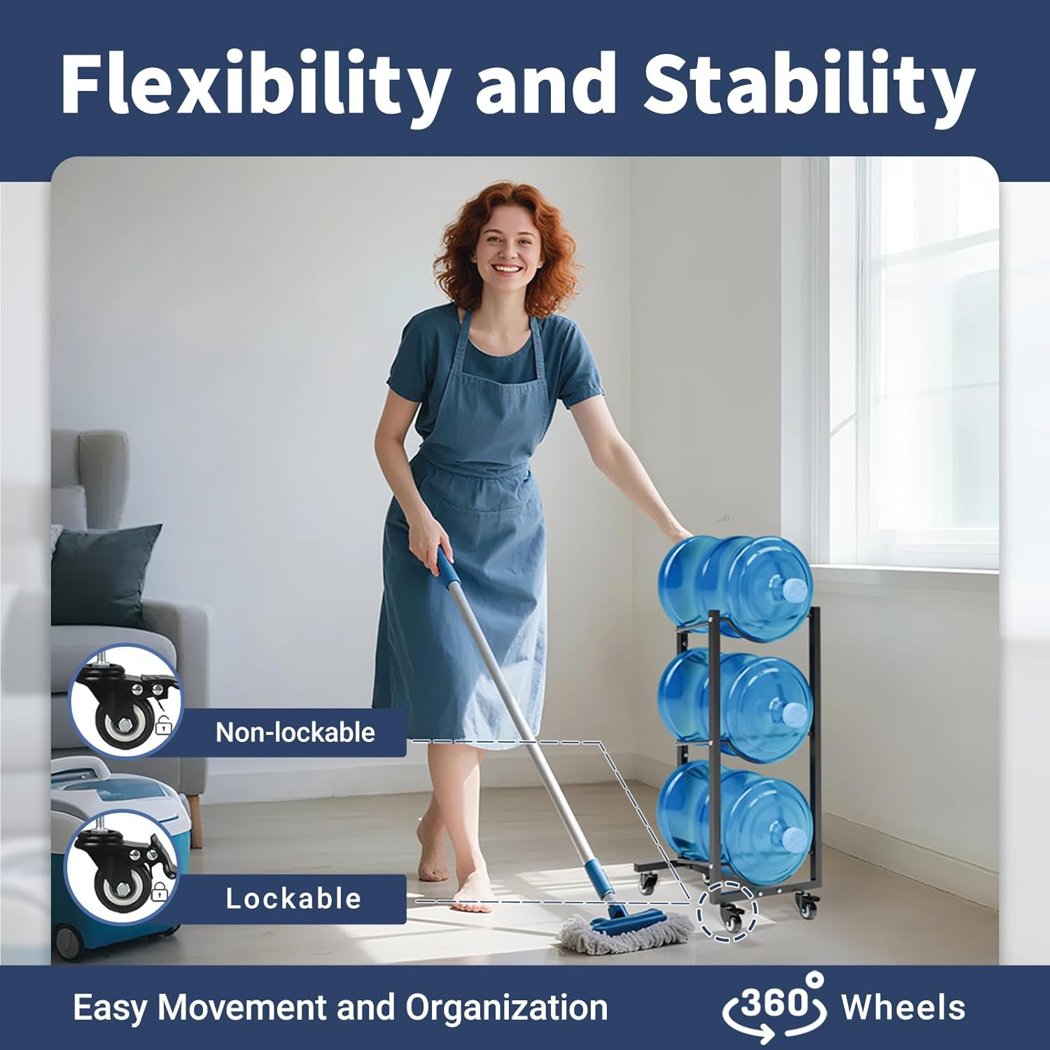 - Flexibility and Stability: The cooler water bottle organizer rack with wheels is designed for easy movement and organization. Features four 360° wheels—two lockable for stability, two free-spinning for mobility—ensuring smooth mobility and secure placement. Perfect for boosting cleaning efficiency.