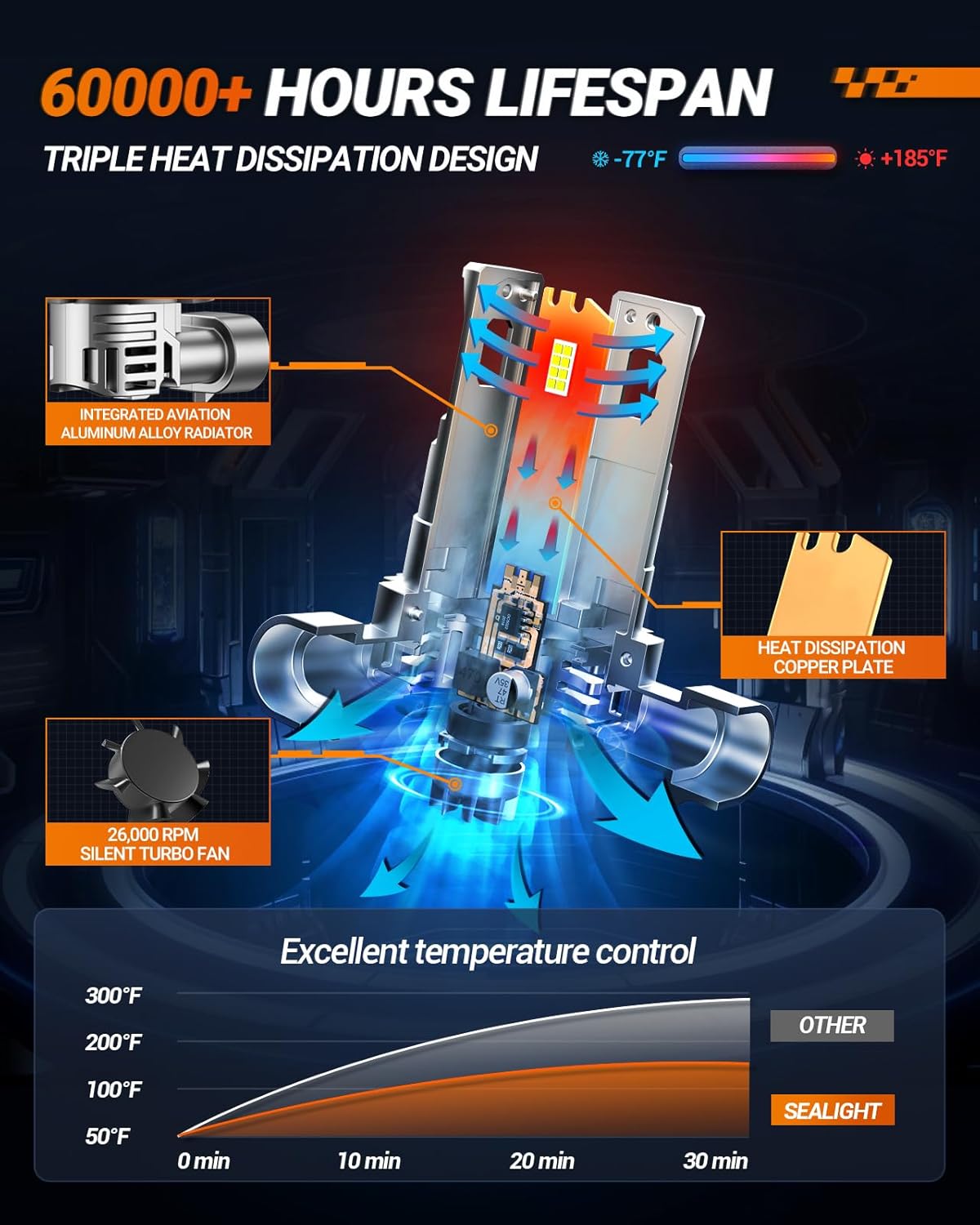- 【60000+ Hours Lifespan】Equipped with a 13000RPM high-speed cooling fan, Sealight 9005 HB3 H11 bulbs or Fog Lights offer exceptional heat dissipation, providing over 60000 hours of reliable illumination and smooth operation.In addition, IP67 waterproof technology can make it use in a variety of weather