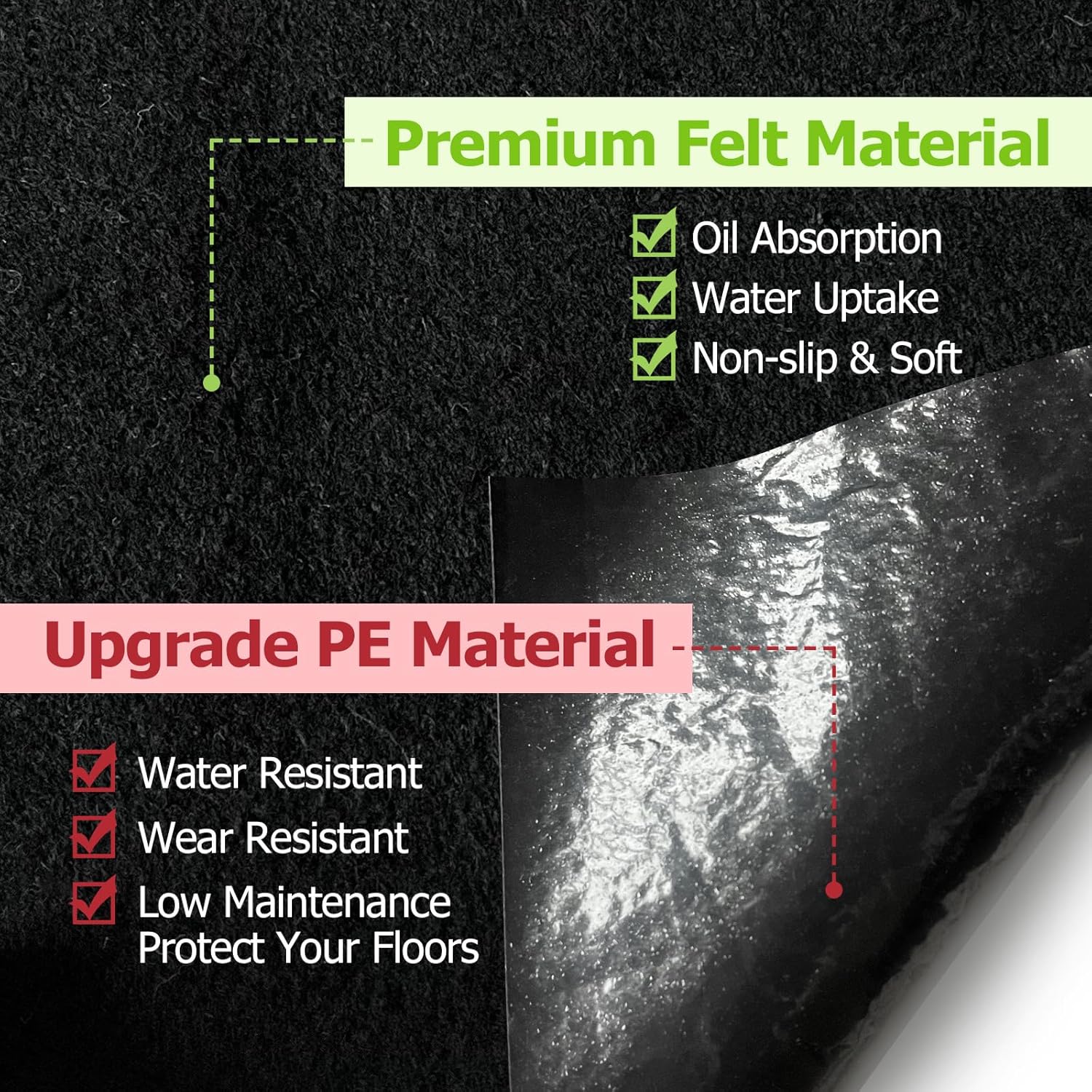 - RELIABLE MATERIAL: Waterproof outdoor carport mat, the surface is made of felt, can absorb water and oil, will not slip, can effectively waterproof and dustproof; the bottom is made of PE material, wear-resistant, waterproof, non-slip; can effectively protect the ground or the storage shed floor, to prevent the leakage of underground water.