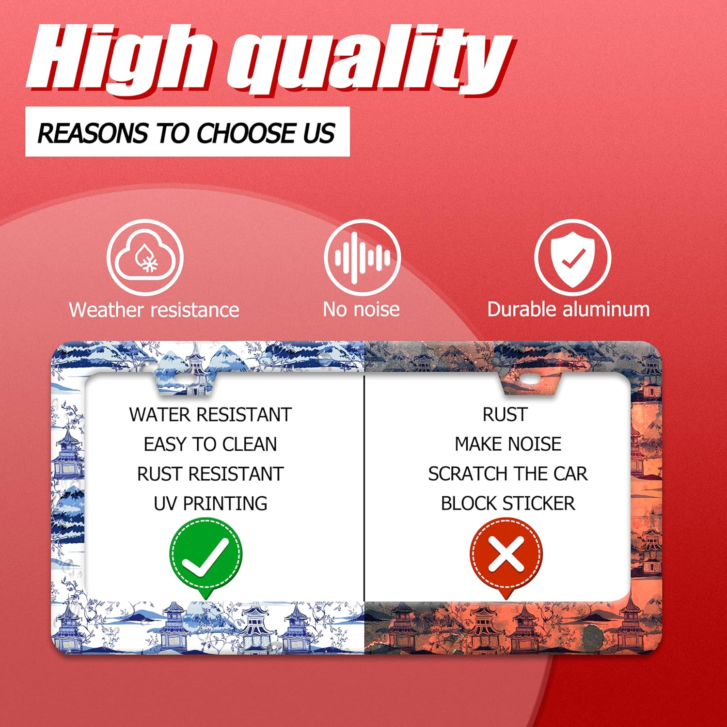Blue White Porcelain Pattern License Plate Frame Chinoiserie License Plate Frames Funny for Car Decorative Parts Stainless Stee License Plate for Standard Us Canada 12x6 Inch