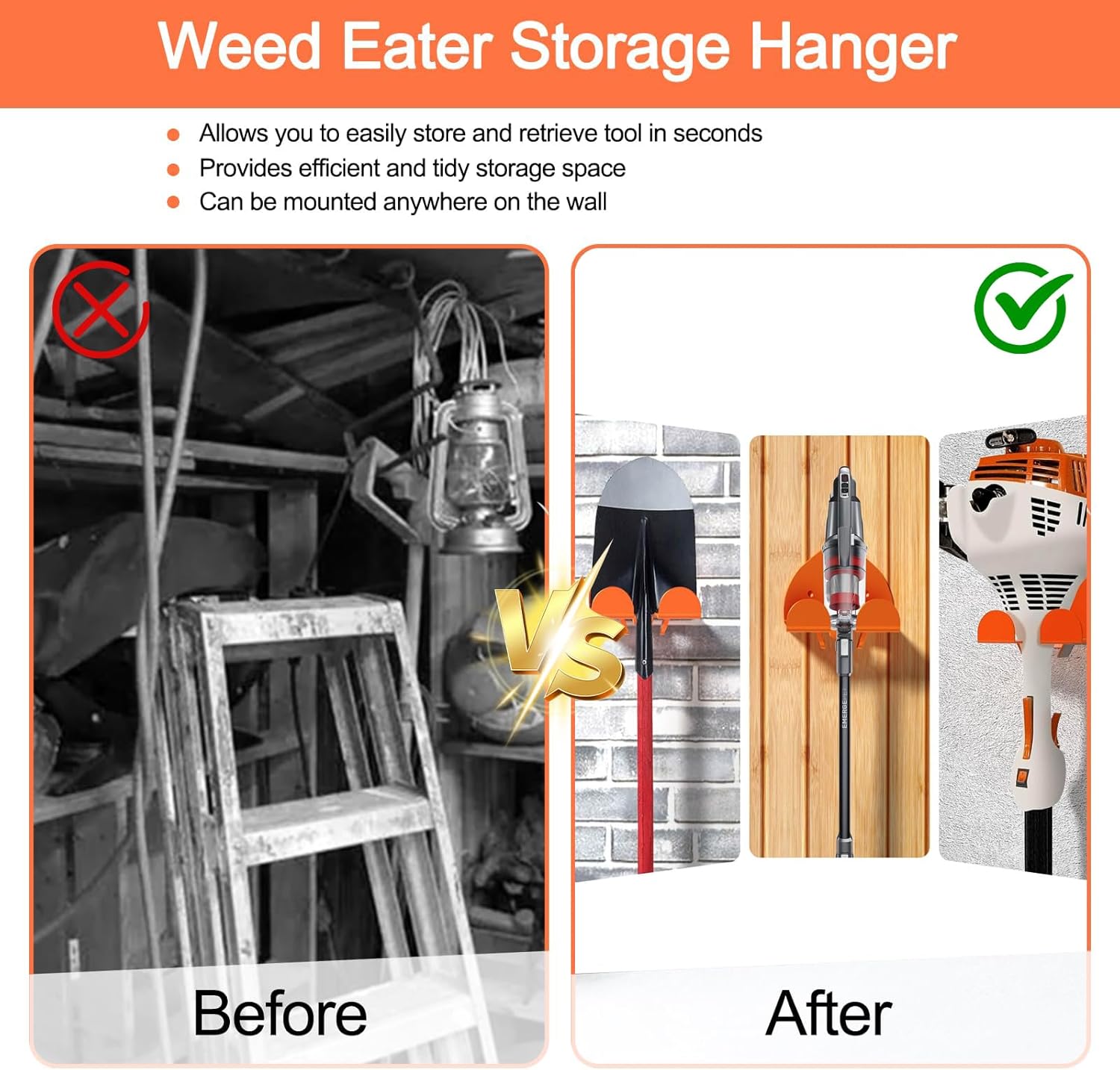 - Space-Saving Multi-Tool Storage - Maximizes garage, shed, or workshop space by holding trimmers, hedge trimmers, drills, brooms, hoses, and other tools vertically on the wall.